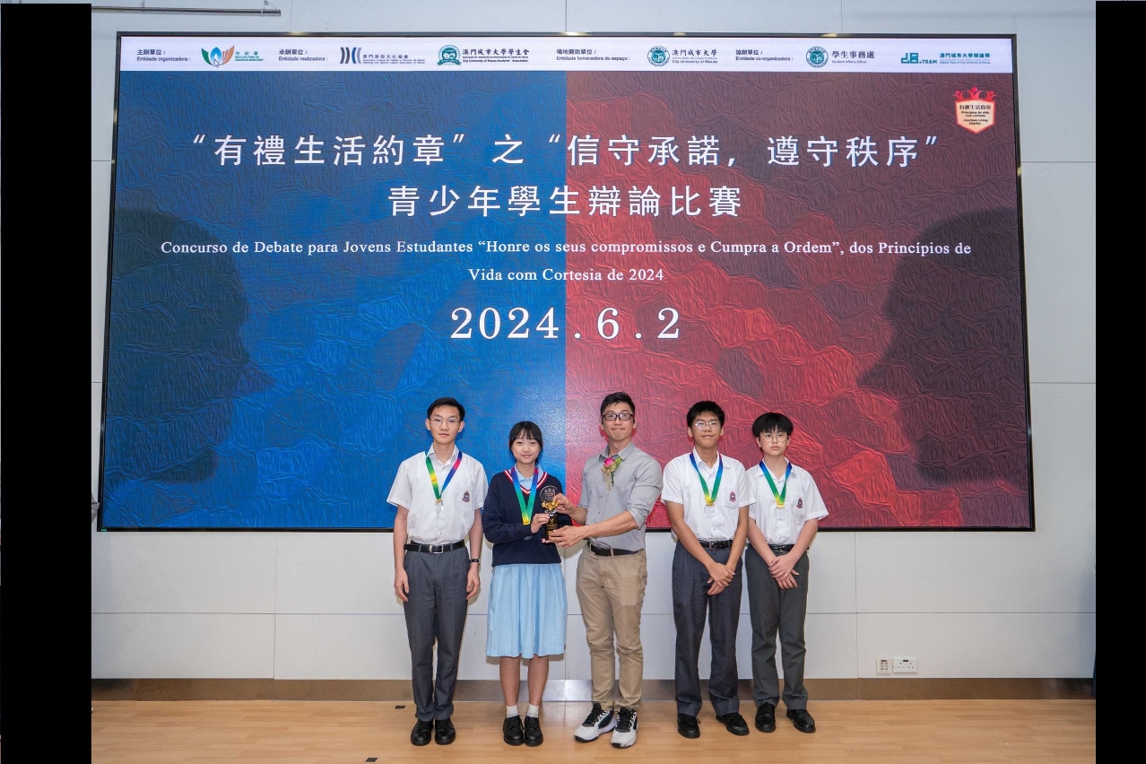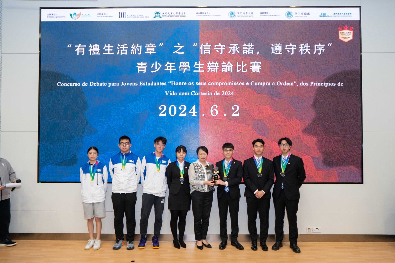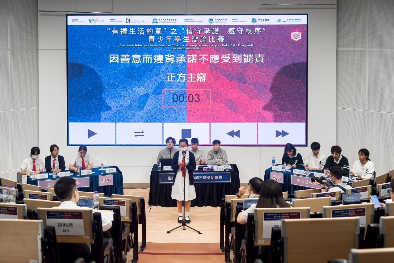 由市政署主办、澳门演辩文化协会及澳门城市大学学生会协办的“2024‘有礼生活约章’之‘信守承诺’及‘遵守秩序’青少年学生辩论比赛”日前顺利举行。来自大专院校及中学的十八支队伍,分别参加广东话少年组、广东话青年组及普通话组别比赛,最后由圣公会(澳门)蔡高中学、澳门大学及澳门科技大学B队分别夺得所在组别的冠军。