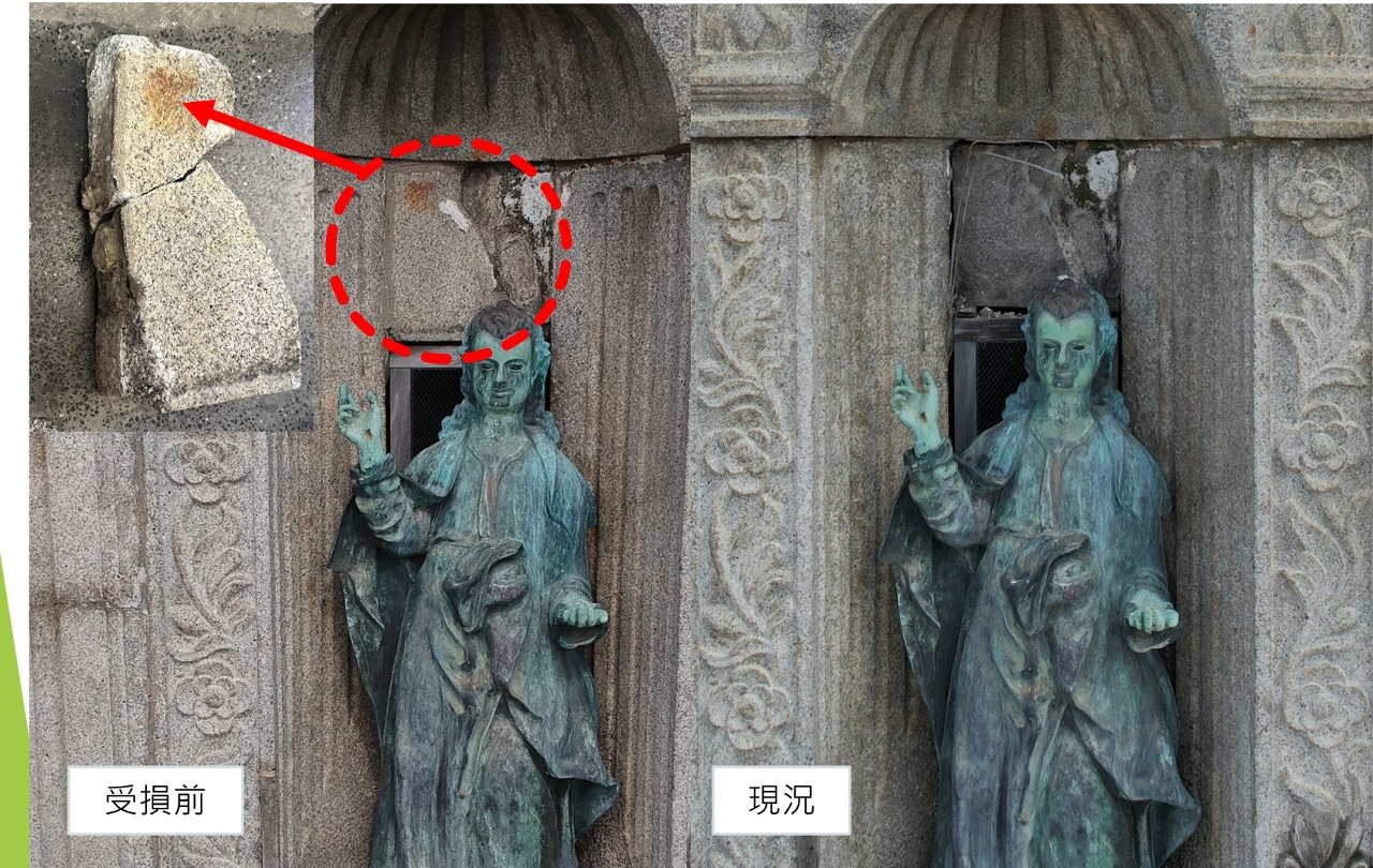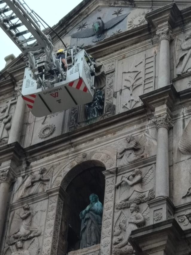 就6月中旬大三巴前地石阶发现有石块落下一事,文化局经过多方面调查及资料比对,初步认为事件属大三巴立面上方第二层圣像壁龛受到雷电侧向撃中所致,后续文化局将进行修复及与专业文保机构研究应对方案。