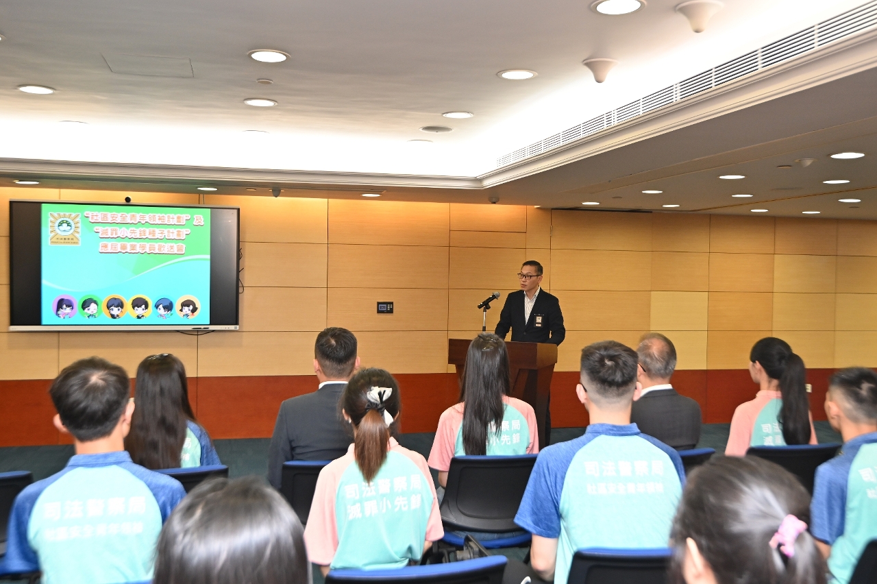司法警察局为“社区安全青年领袖计划”及“灭罪小先锋种子计划”应届大学及中学毕业学员举办欢送会,司警局局长薛仲明勉励学员继续发扬社区安全青年领袖和灭罪小先锋的精神,协助警方在校园和社会传播警民合作、防罪守法的讯息,并带动更多同辈关心和服务社会,担当起澳门青年的责任和使命,共同为国家和澳门的发展作出有力承担。