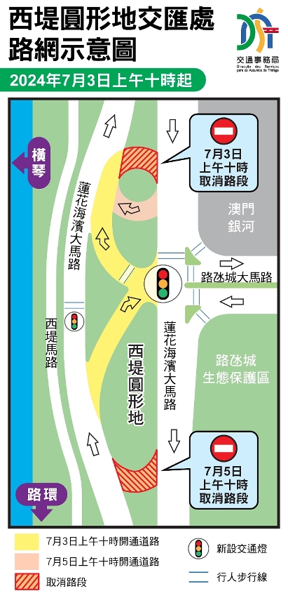 配合西堤圆形地交汇处的路网重整,于7月3日(周三)上午10时起,由路氹城大马路经莲花海滨大马路往氹仔方向,或由海滨圆形地经莲花海滨大马路往路氹城大马路的路型将有所调整,届时车辆将可利用西堤圆形地中央的新建道路进出,但周边仍须接续进行道路重整及路面重铺而实施临时交通改道(详见附表),而莲花海滨大马路与路氹城大马路往来行车方向均维持2线行车,以保持区内的交通循环,同时配合新道路的开通,将启用设于莲花海滨大马路(近生态区)与路氹城大马路交界的交通灯,维持相关路段的行车、行人通行。巴士方面,亦会按照新路型调整行车,但停靠站点不变。