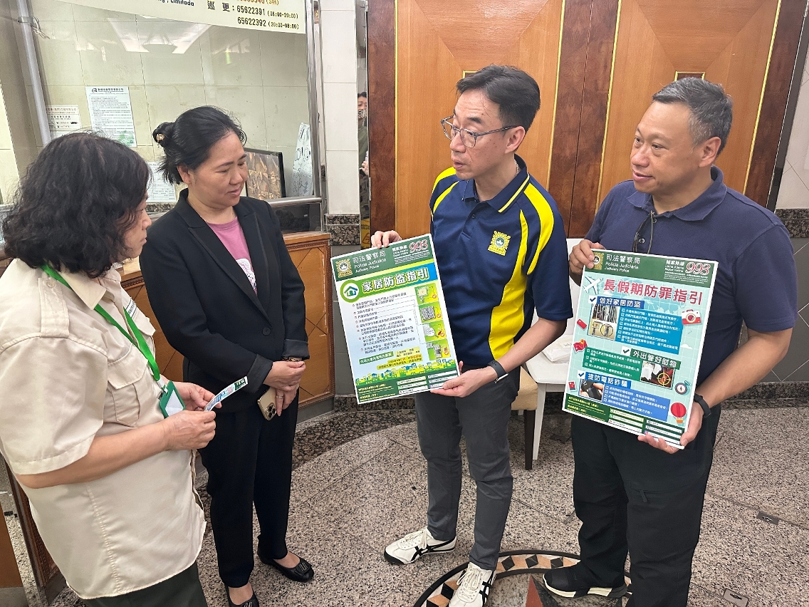 因应暑假期间有不少居民会外游度假,为提醒居民注意防罪,勿让不法之徒有机可乘,司法警察局与属“司警局大厦防罪之友”的本澳社团会谈,共商加强警民合作,将相关防罪资讯传递给社区居民。此外,司警局人员还联同各社团成员前往本澳各区进行防罪宣传,向居民、商户及物业管理前线人员讲解防罪资讯,促使警民合力防范罪案发生。