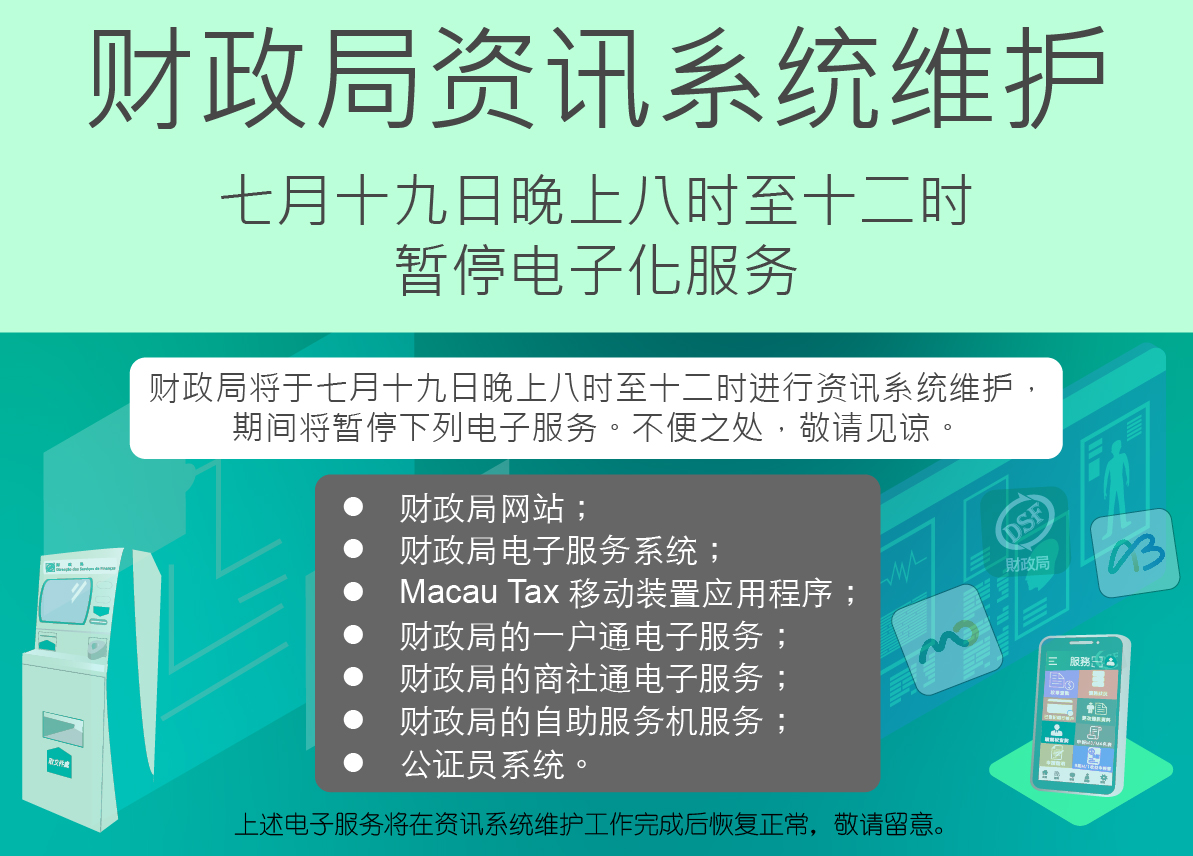 财政局将于七月十九日晚上八时至十二时进行资讯系统维护,期间将暂停下列电子服务。不便之处,敬请见谅。