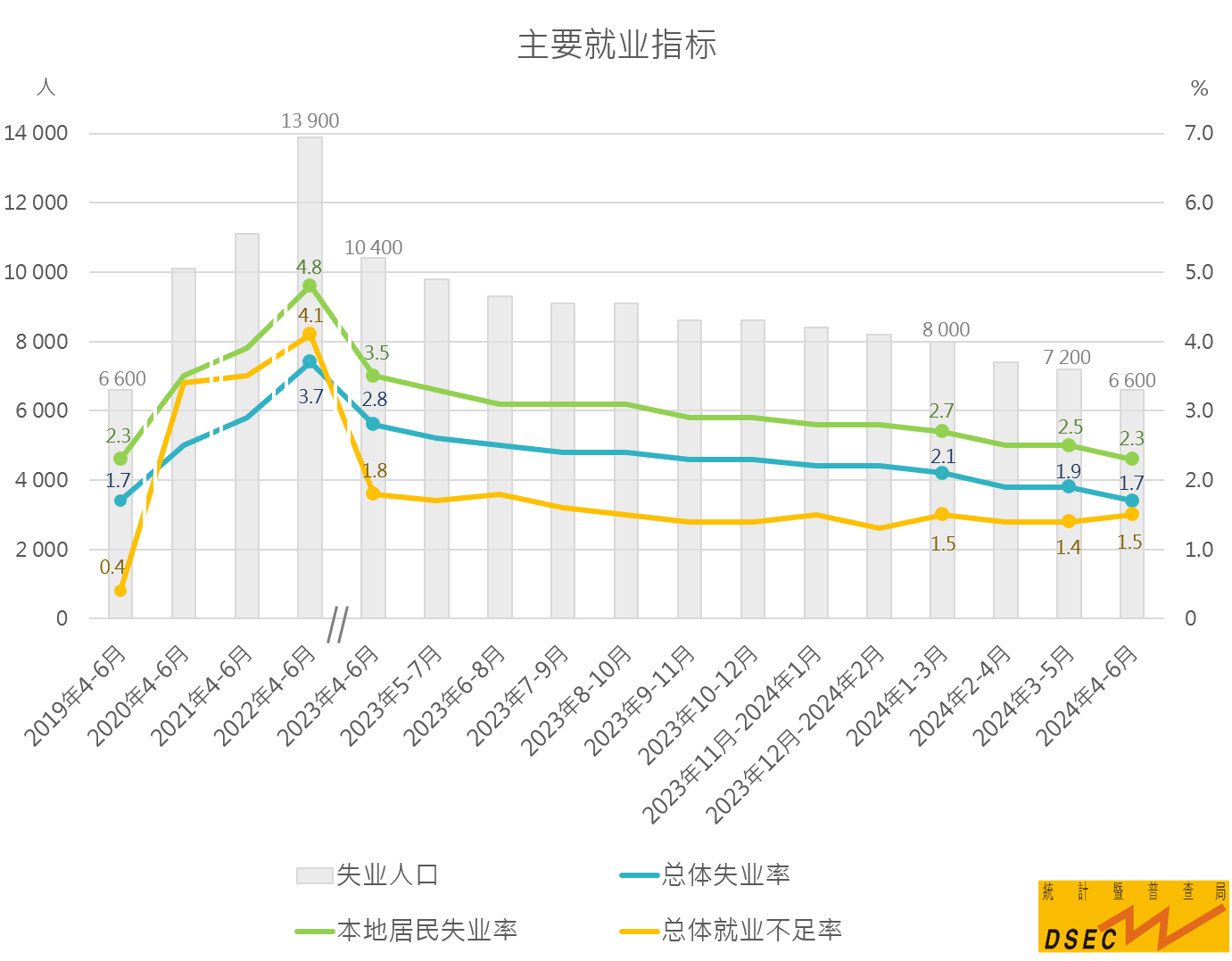 统计暨普查局资料显示,2024年第2季总体失业率(1.7%)及本地居民失业率(2.3%)按季均下跌0.4个百分点,并已回复至2019年第2季水平;就业不足率(1.5%)则持平。