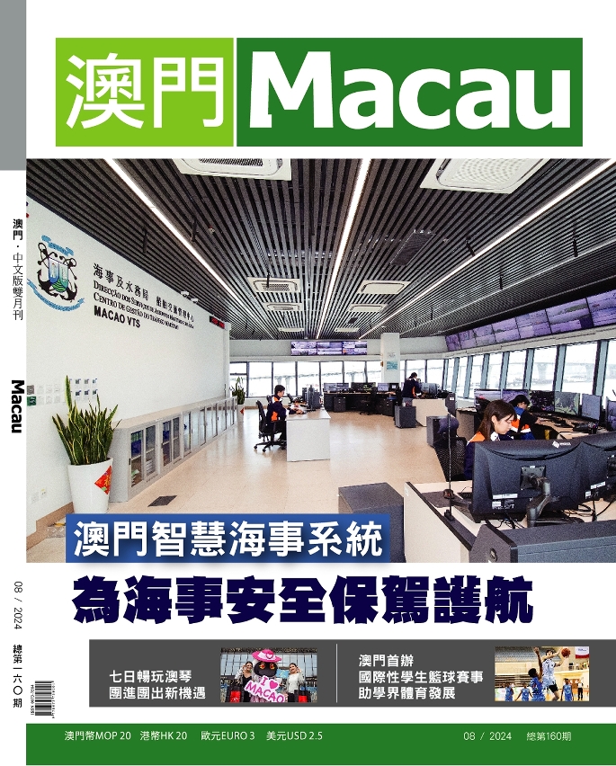 《澳门》杂志(中文版)第160期现已出版。今期精彩内容包括介绍“澳门智慧海事系统”对澳门海事工作的帮助;“团进团出”政策推动澳琴两地旅游合作的作用;20个国家和地区的37支队伍齐聚澳门的世界中学生篮球锦标赛等。