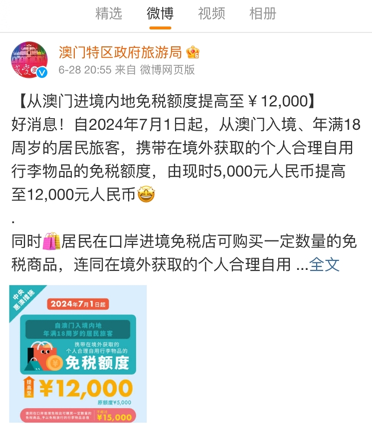 财政部、海关总署及税务总局于6月28日公布,对自澳门进境,年满18周岁的居民旅客,携带在境外获取的个人合理自用行李物品,总值在12,000元人民币以内的予以免税放行。同时,在设有进境免税店的口岸,允许上述旅客在口岸进境免税店购买一定数量的免税商品,连同在境外获取的个人合理自用行李物品总值在15,000元人民币以内的予以免税放行。上述有关措施已于7月1日起先行在拱北及港珠澳大桥珠海公路等6个口岸实施,并自今(8月1日)起,推广至全部进境口岸(横琴“一线”口岸除外)。