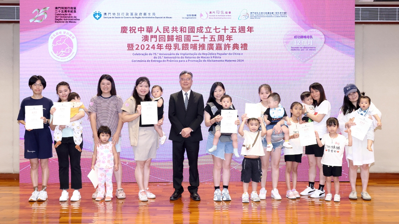 为持续推动及响应国际母乳喂哺周,由卫生局主办,澳门母乳协会、澳门母乳及育儿推广协会协办的“2024母乳喂哺推广嘉许典礼”于日前圆满举行。卫生局罗奕龙局长、郭昌宇副局长、陈永华副局长、吕绮玲代副局长、社会保障基金行政管理委员会陈宝云副主席和39个公私营机构、3间学校代表、约53个家庭,共约200多人出席是次活动。
