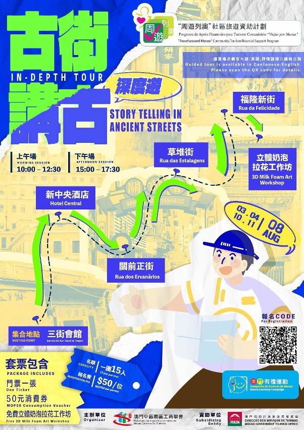 “古街讲古‧深度游”于8月3日至11日期间的周六日举行,上、下午各一场,带领参加者探索澳门世遗古街的历史踪迹,从关前街、草堆街到福隆新街,一步步揭开澳门的历史故事,再登上观景台饱览旧城区独特景色及体验立体奶泡拉花工作坊。