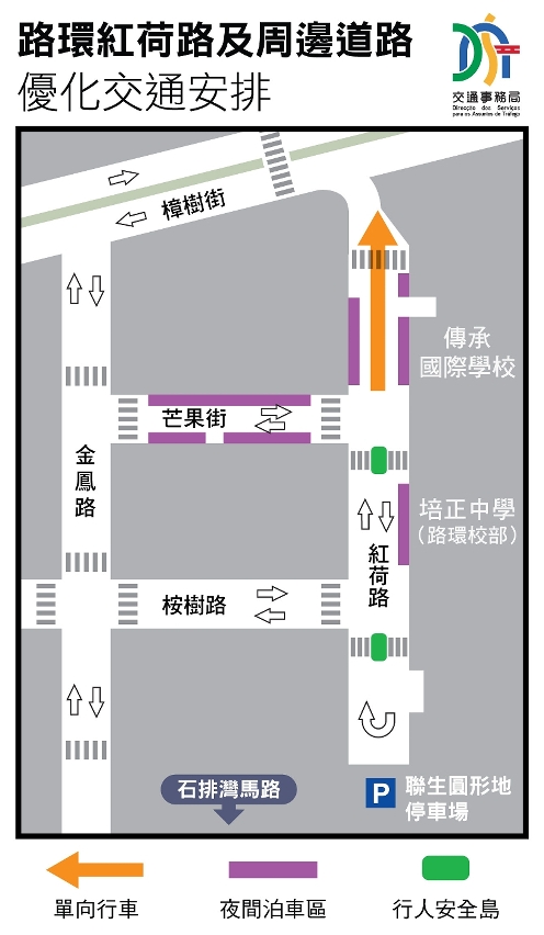 当中,芒果街与樟树路之间的一段红荷路改为单向行车,以理顺及简化相关道路的行车秩序。而考虑到学校周边区域增加的行人过路需求,红荷路与芒果街、桉树路的交界路口分别增设斑马线、行人安全岛及铁栏等设施,以提升行人过路安全;同时,调整红荷路及芒果街的路边泊车区,增加时限性上落客货区,以平衡邻近工业区及学校的上落客货及夜间停泊车需要。