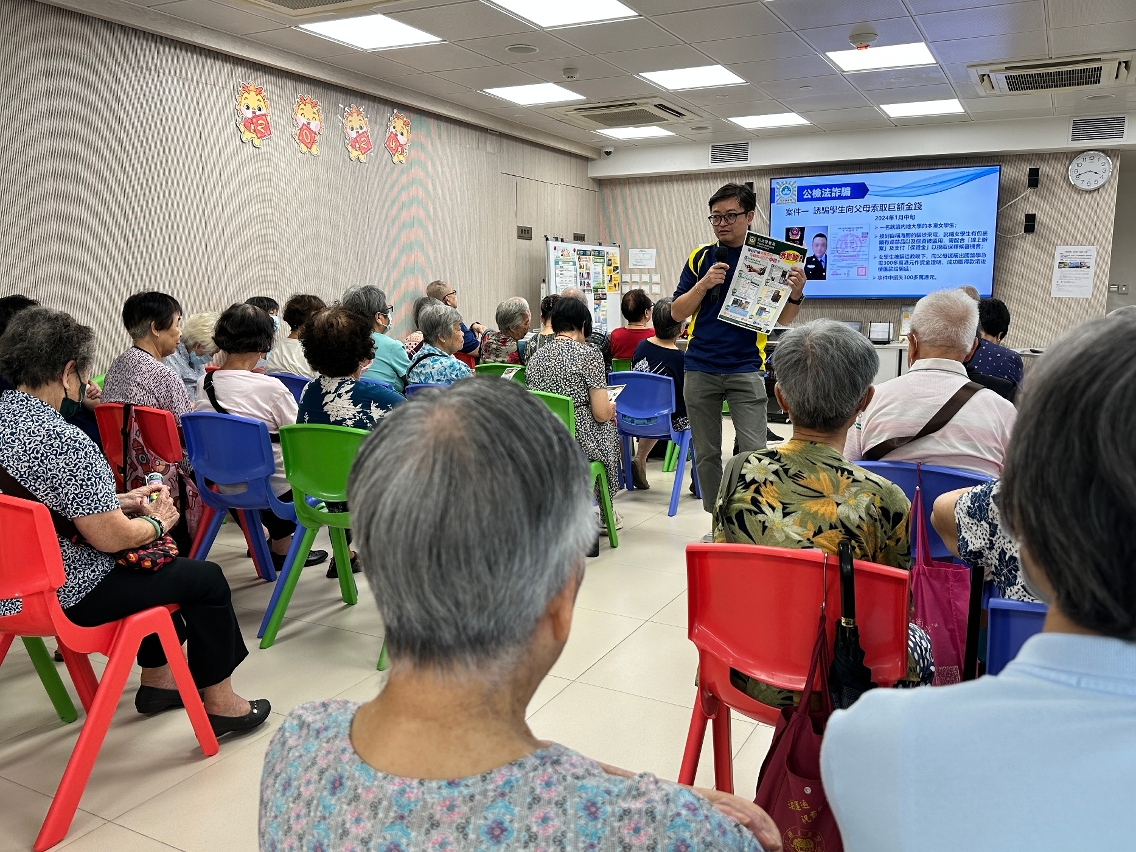 7月12日至8月19日期间,司警局人员先后到澳门明爱辖下多间长者中心合共举办9场“预防电讯网络诈骗”及“防盗防抢”讲座,共逾460名长者及其亲友参与。