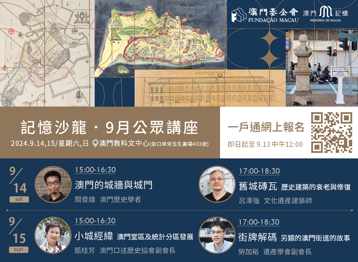 与此同时,“记忆沙龙”亦于9月14及15日下午在澳门教科文中心举行,将送上四场不同主题的历史文化讲座,分别由关俊雄主讲“澳门的城墙与城门”、甄桂芳主讲“小城经纬——澳门堂区及统计分区历史发展”、吕泽强主讲“旧城砖瓦——历史建筑的衰老与修复”以及劳加裕主讲“街牌解码——另类的澳门街道的故事”,现正于“澳门公共服务一户通”中开放报名 (https://activity.mo.gov.mo),9月13日 (五) 中午12时截止。诚邀市民与亲友一同到场参与,在书香中感受小城历史,查询可于办公时间内致电8797 8565。