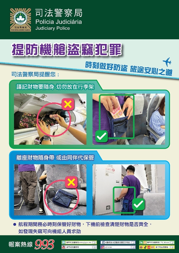 为提高市民和旅客的防罪警惕,及早做好防盗措施,减低机舱盗窃案发生的机会,司法警察局联同澳门国际机场专营股份有限公司、澳门航空股份公司于9月17日展开“预防机舱盗窃”宣传活动,举办面向航空业界前线工作人员的“预防机舱盗窃”培训讲座,随后举行由司警局及澳门航空股份公司合作摄制的“时刻做好防盗,旅途安心之道”防罪影片首映仪式。仪式结束后,司警局随即派员前往澳门国际机场,开展预防机舱盗窃系列宣传活动,藉此提升广大市民和旅客的防罪意识,加强警民合作,共同维护机场和航班安全。