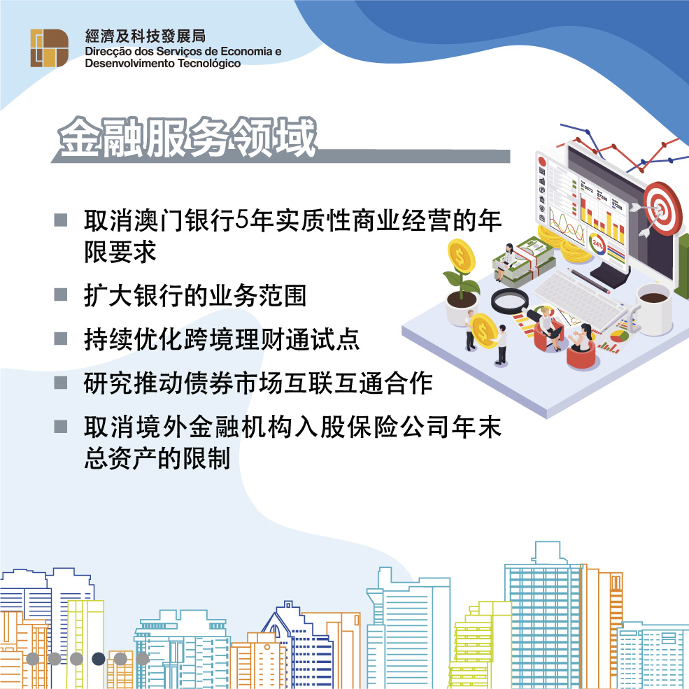 《修订协议二》增加高新科技、金融服务、视听文化等服务领域的开放措施,支持澳门“1+4”适度多元发展策略,为澳门经济适度多元发展创造新空间。科技领域方面,对符合条件的澳门“科技企业认证计划”企业在内地视同与高新技术企业除税收优惠外的同等待遇、允许符合条件的澳门服务提供者在内地获得相关技术资质认可、取消澳门企业在试点地区提供互联网数据中心等业务的股比限制等。金融服务领域方面,取消澳门银行5年实质性商业经营的年限要求及境外金融机构入股保险公司年末总资产的限制等。视听文化领域方面,允许澳门企业投资电影制作、与内地合拍电视剧可视为国产电视剧播出和发行等。