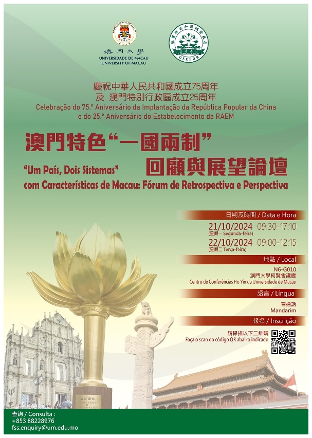 为庆祝中华人民共和国成立75周年及澳门特别行政区成立25周年,澳门大学与澳门特别行政区政策研究和区域发展局将于10月21至22日合办“澳门特色‘一国两制’:回顾与展望论坛”,回顾并总结“一国两制”在澳门的成功实践,同时展望澳门未来的发展,欢迎有兴趣人士报名参与。