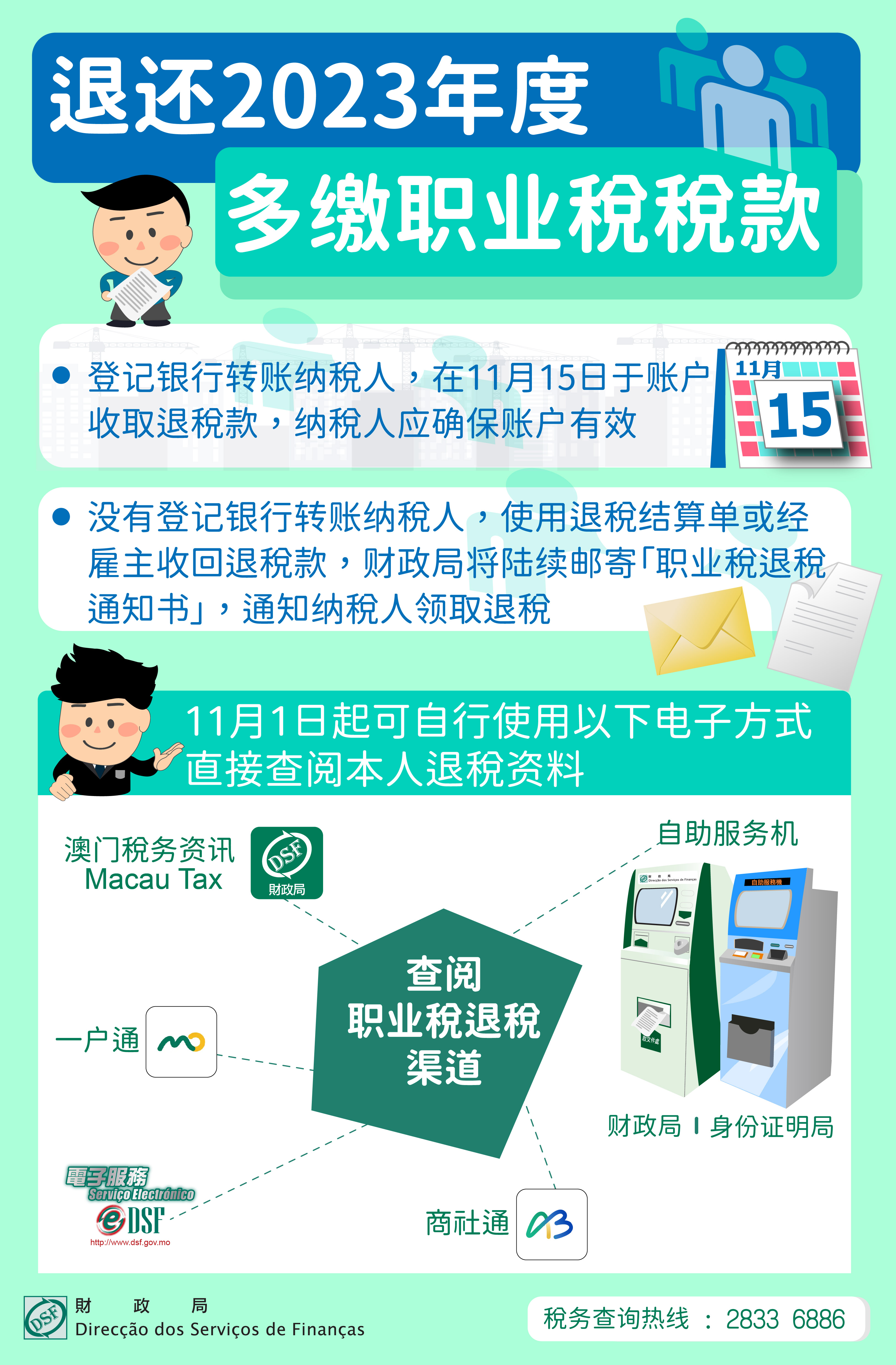 自11月1日起,纳税人可透过财政局移动应用程式“澳门税务资讯Macau Tax”、“一户通”、“商社通”、财政局“电子服务”,以及财政局和身份证明局的自助服务机,查阅2023年度多缴职业税的退税资讯。
