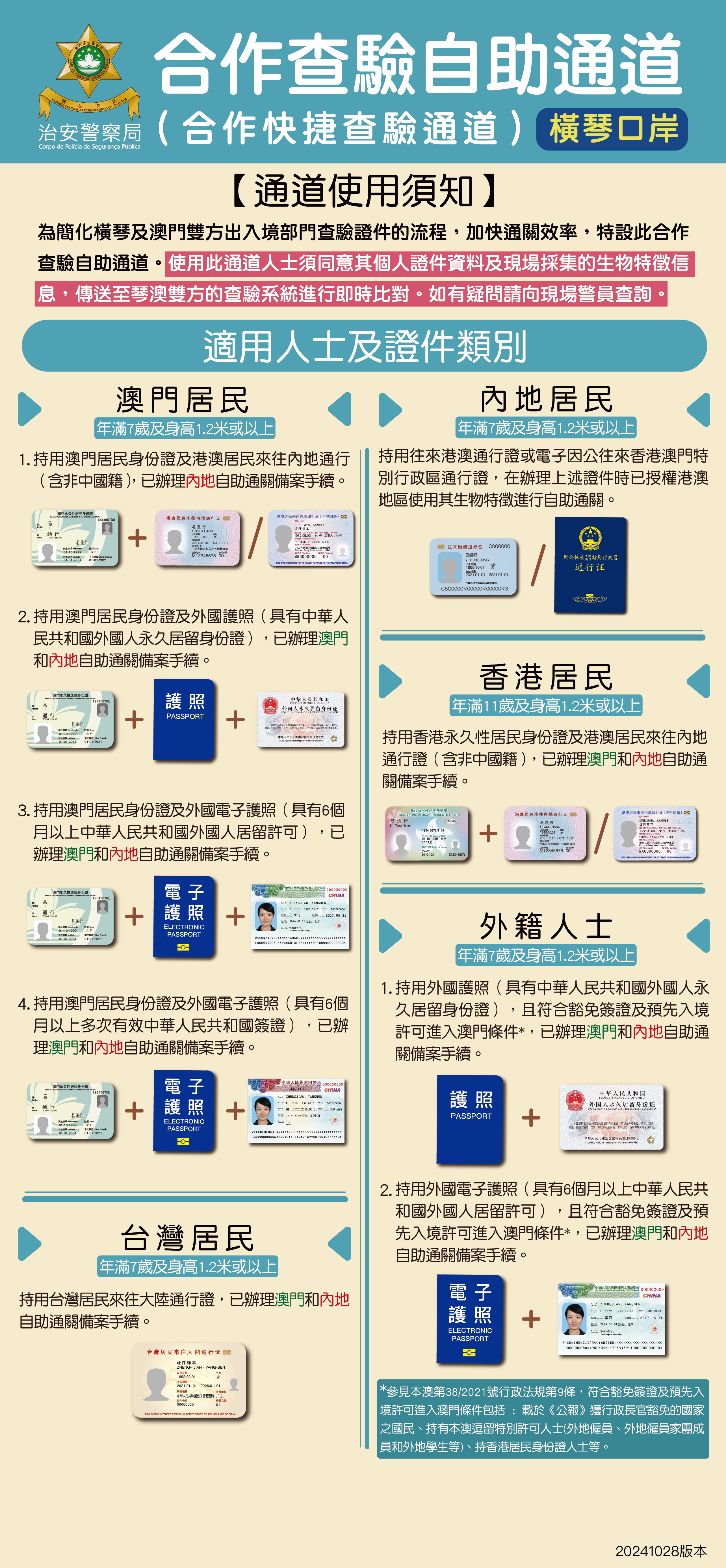 为支持横琴粤澳深度合作区发展,进一步便利琴澳两地人员往来,经治安警察局与珠海出入境边防检查总站共同协商后,自2024年10月28日起在横琴口岸试点扩展「合作查验自助通道」适用人员范围,新增以下3类外国护照持用人,经办理澳门和内地自助通关备案手续后可使用该口岸「合作查验自助通道」通行: