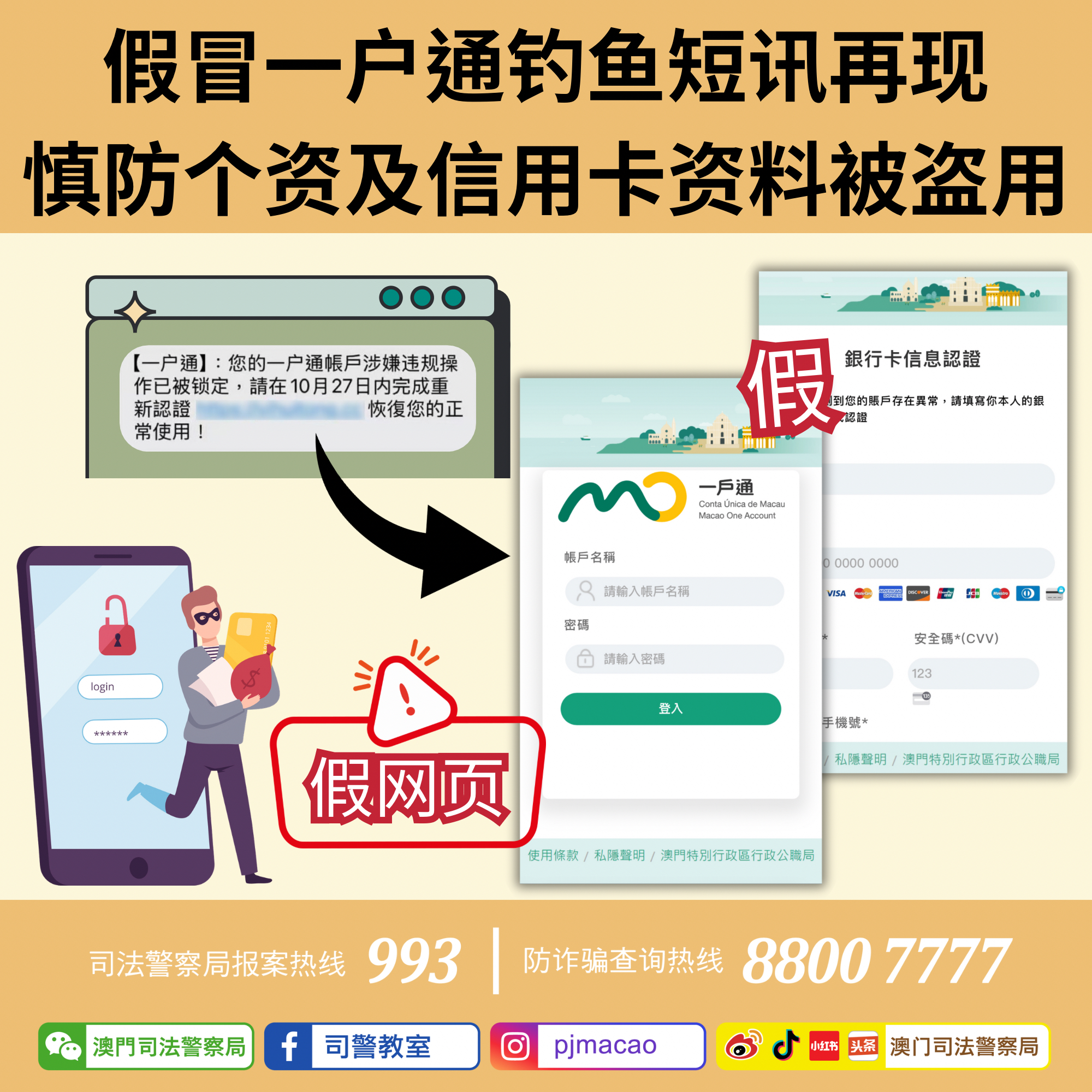司法警察局反诈骗协调中心作出强烈呼吁,市民若收到上述讯息,切勿点撃有关连结及输入帐户资料或信用卡资料,以防有关资料被盗用。如对收到之讯息有怀疑,应致电相关机构进行核实。又或使用司警局“反诈程式”查核相关网站之风险指数,以及致电司警局防诈骗查询热线8800 7777或报案热线993求助。