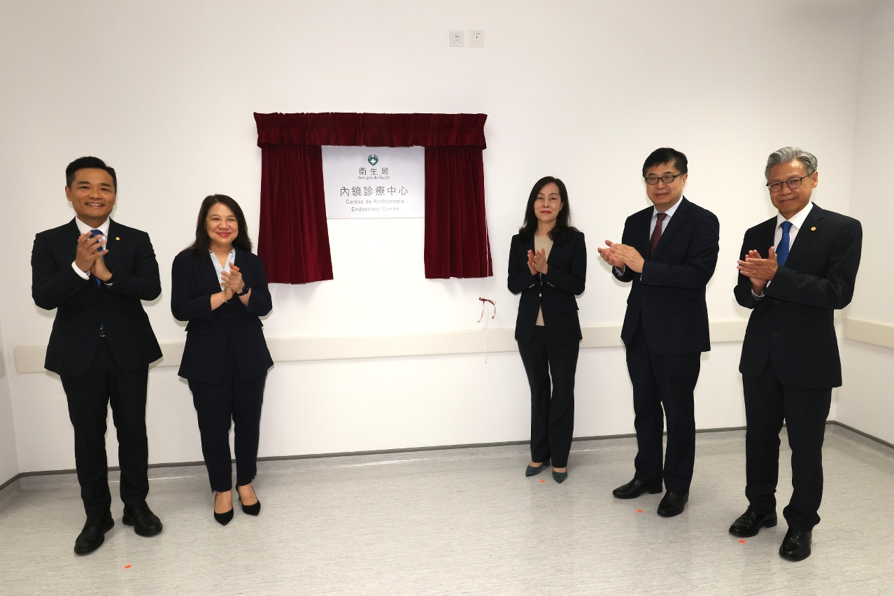 卫生局秉持“预防优先,妥善医疗”的宗旨和“以人为本”的理念,致力提升居民的就医体验,仁伯爵综合医院将位于若宪马路急诊部门口旁的内窥镜区优化整合为内镜诊疗中心(下称“中心”)。今(28)日举行中心的揭幕仪式。社会文化司欧阳瑜司长、社会文化司司长办公室何钰珊主任、中央人民政府驻澳门特别行政区联络办公室宣传文化部万速成部长、卫生局罗奕龙局长、郭昌宇院长共同主持了揭幕仪式。