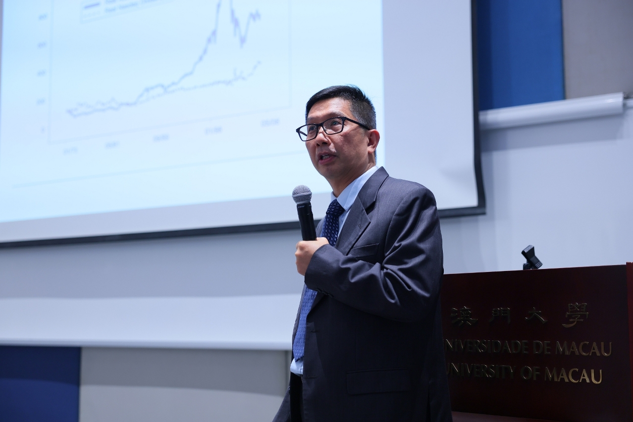澳门大学今(1)日举行“澳门大学发展基金会冠名教授讲座",由澳门大学发展基金会金融及经济学讲座教授余俊以“计量经济学与经济监控”为题发表演说,分析各种经济泡沫特征以防止金融危机。讲座吸引一众政府部门代表、澳大师生及公众人士参与。