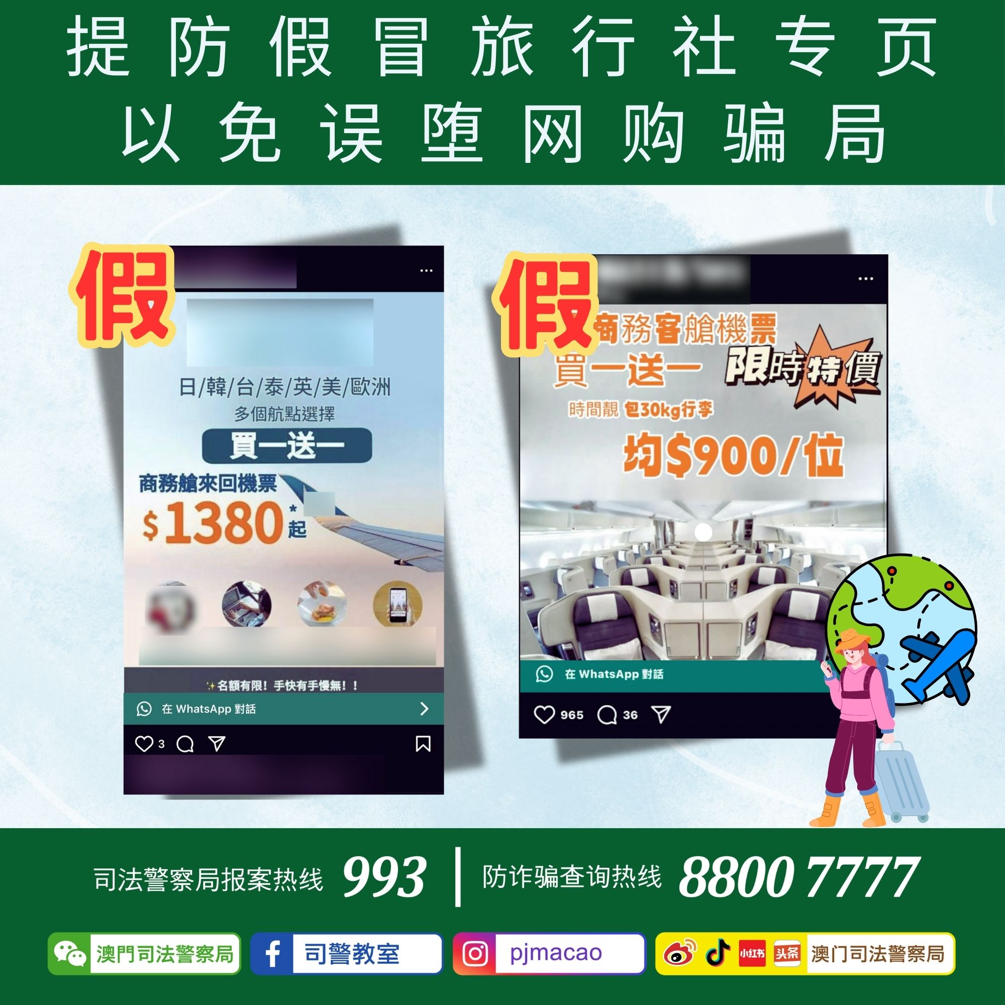 近日邻近地区发生多宗假冒旅行社代订旅游产品的骗案,骗徒先在网上社交平台假冒知名旅行社开设专页,并以广告方式发布帖文,讹称有各种折扣优惠(如“买一送一”、“限时特价”等)出售机票、酒店,吸引市民点击广告帖文,点击后将跳转至通讯软件进行联络,而骗徒会以支付订金或全额费用为由,诱骗市民转账至讹称是属于该“旅行社”的银行账户,借此骗取金钱。