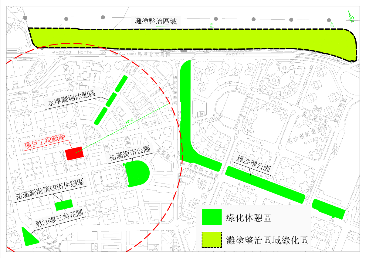 夹心房屋项目周边设有多个绿化休憩场地供市民使用,包括祐汉新村第四街休憩区、祐汉街市公园、永宁广场休憩区及黑沙环公园等,可满足该区市民对绿化休憩设施的需求。此外,随着轻轨东线的建设,沿黑沙环马场北大马路的滩涂整治区域将建设面积超过50,000平方米的绿化休憩区,届时将有倍增的休憩空间供市民使用。