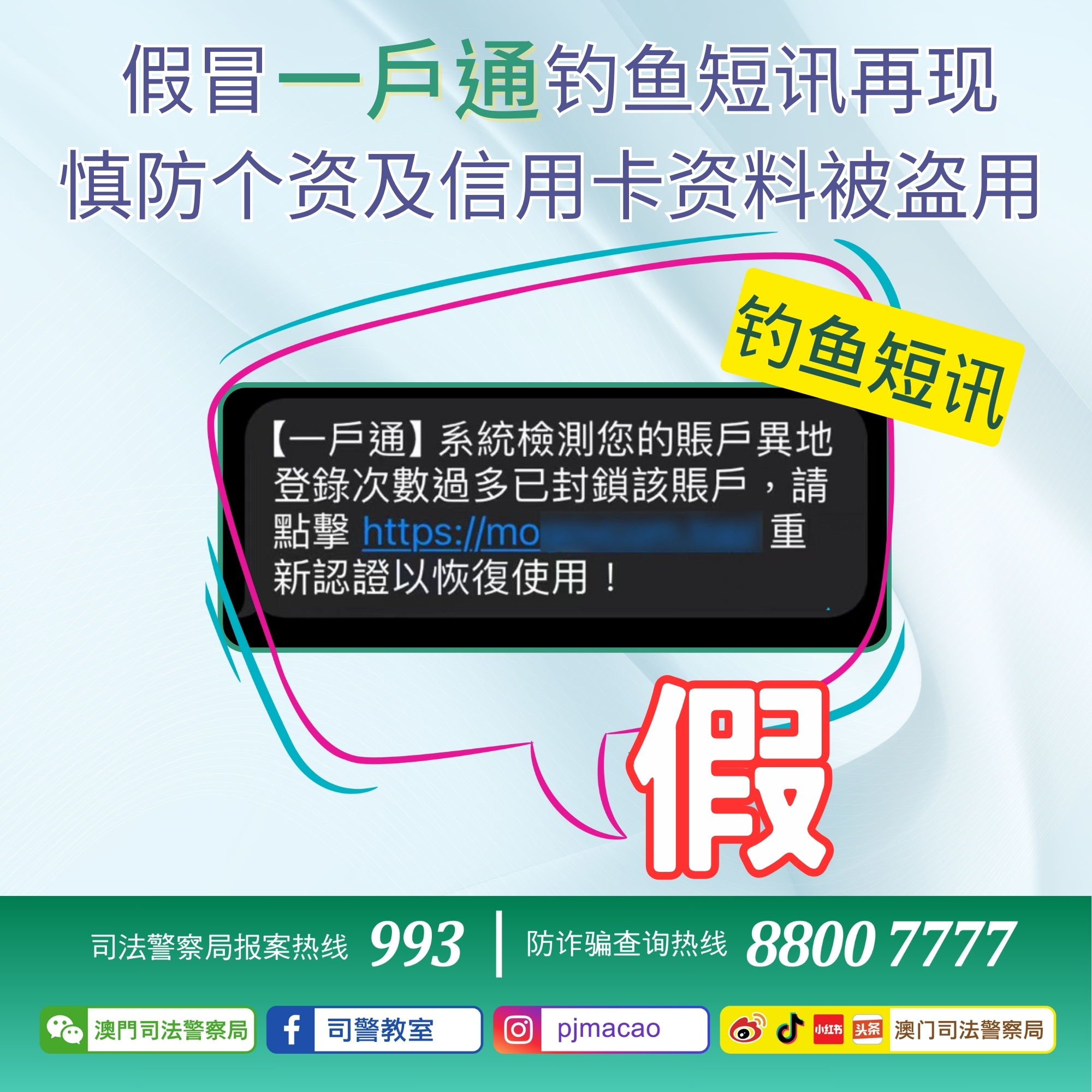 今日(2024年11月8日),司法警察局再次发现有人假冒一户通发出钓鱼短讯,内容以一户通帐户异地登陆次数过多被封锁为由,要求市民点撃短讯内附带的连结,并要求输入信用卡资料进行认证以便恢复正常使用。