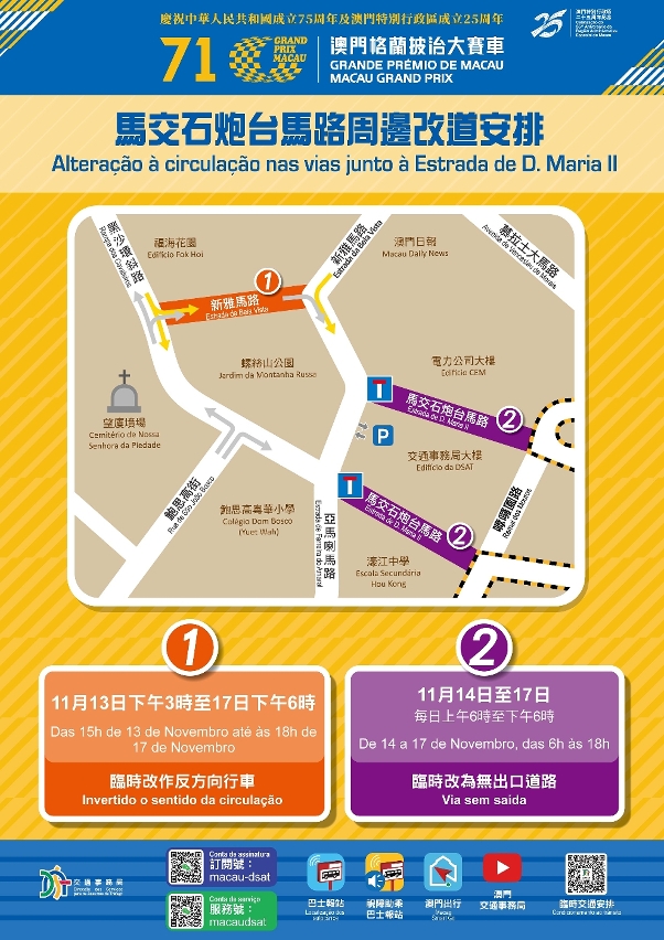 当中,11月13日(周三)至17日(周日),亚马喇前地与城市日大马路之间一段仙德丽街临时由单向改为双向交通、福海花园与新雅马路行车天桥之间的一段新雅马路临时改作反方向通车。至于其他于赛事期间每日凌晨至傍晚时段封闭之赛道及周边路口,会因应实际情况,于当天的赛事结束后尽早解封。