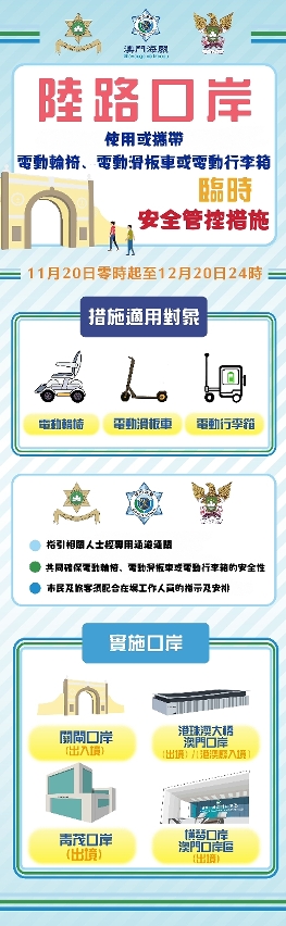 随着澳门特区即将迎来回归祖国25周年庆典,预计各口岸出入境客流量将有所上升,为了保障各陆路口岸出入境通关畅顺及安全,尤其确保出入境人士在通关时使用或携带电动轮椅、电动滑板车或电动行李箱的安全情况,于11月20日零时至12月20日24时期间,澳门海关、治安警察局及消防局将在本澳4个陆路口岸对使用或携带上述物品之通关人士联合执行临时安全管控措施。