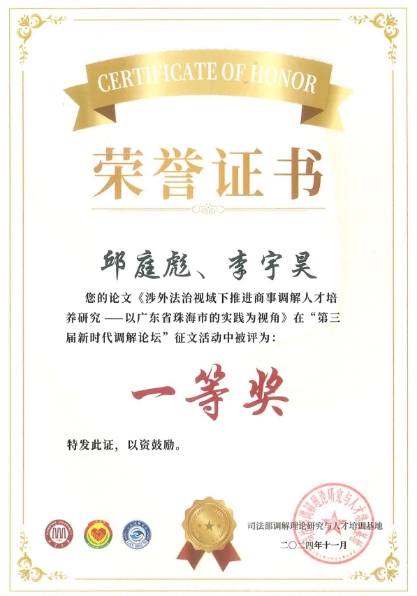 由澳门大学法学院副院长兼博士生导师邱庭彪与该院博士生李宇昊共同撰写的论文,为涉外法治视域下培养商事调解人才提供了有益的思路和启示,于第三届新时代调解论坛征文中荣获一等奖,是澳门地区唯一的一等奖论文。