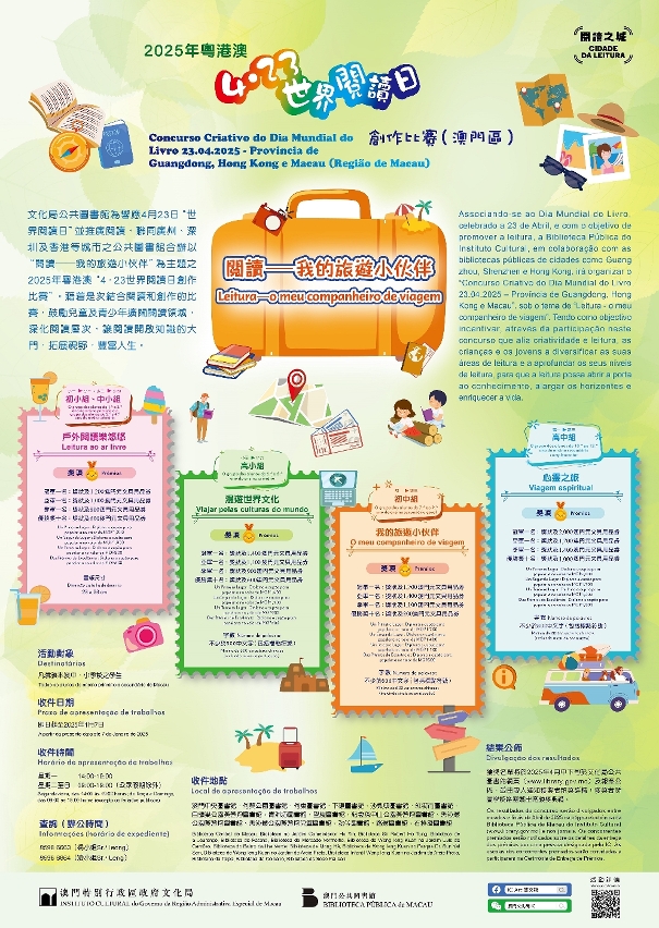 为响应每年4月23日“世界阅读日”,文化局公共图书馆联同广州、深圳及香港等城市之公共图书馆联合举办2025年粤港澳“4‧23世界阅读日创作比赛”,主题为“阅读——我的旅游小伙伴”,藉阅读和创作相结合,鼓励儿童及青少年扩阔阅读领域,深化阅读能力层次,让阅读开启知识的大门,拓展视野,丰富心灵。澳门区比赛的收件期为即日起至2025年1月7日。