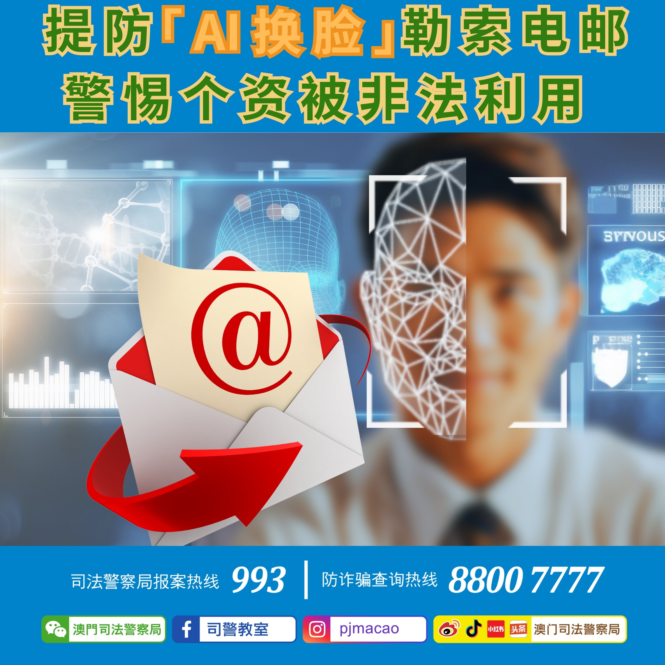 近日司法警察局接获多名市民检举,报称分别收到勒索电子邮件,邮件内附有一张以「AI」技术合成的事主与一名女子的不雅照片,企图以此勒索事主金钱,要求事主透过WhatsApp联络。事件中有赖各名事主日常均有留意警方防骗资讯、保持警惕并及时报案处理,暂未有人有金钱损失。