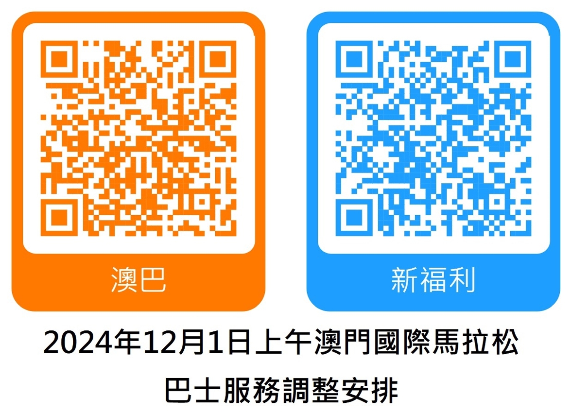 巴士方面,54条巴士路线于12月1日(周日)由清晨4时30分(夜间路线)或首班车(日间路线)起改道行驶及调整部份停靠站点,多个巴士站临时停用,直至活动结束。详情可参阅两巴网页(澳巴:http://www.tcm.com.mo/web/NewsVB/data/1411_cn.PDF、新福利:https://www.transmac.com.mo/route-change/tr-20241128-01/)。