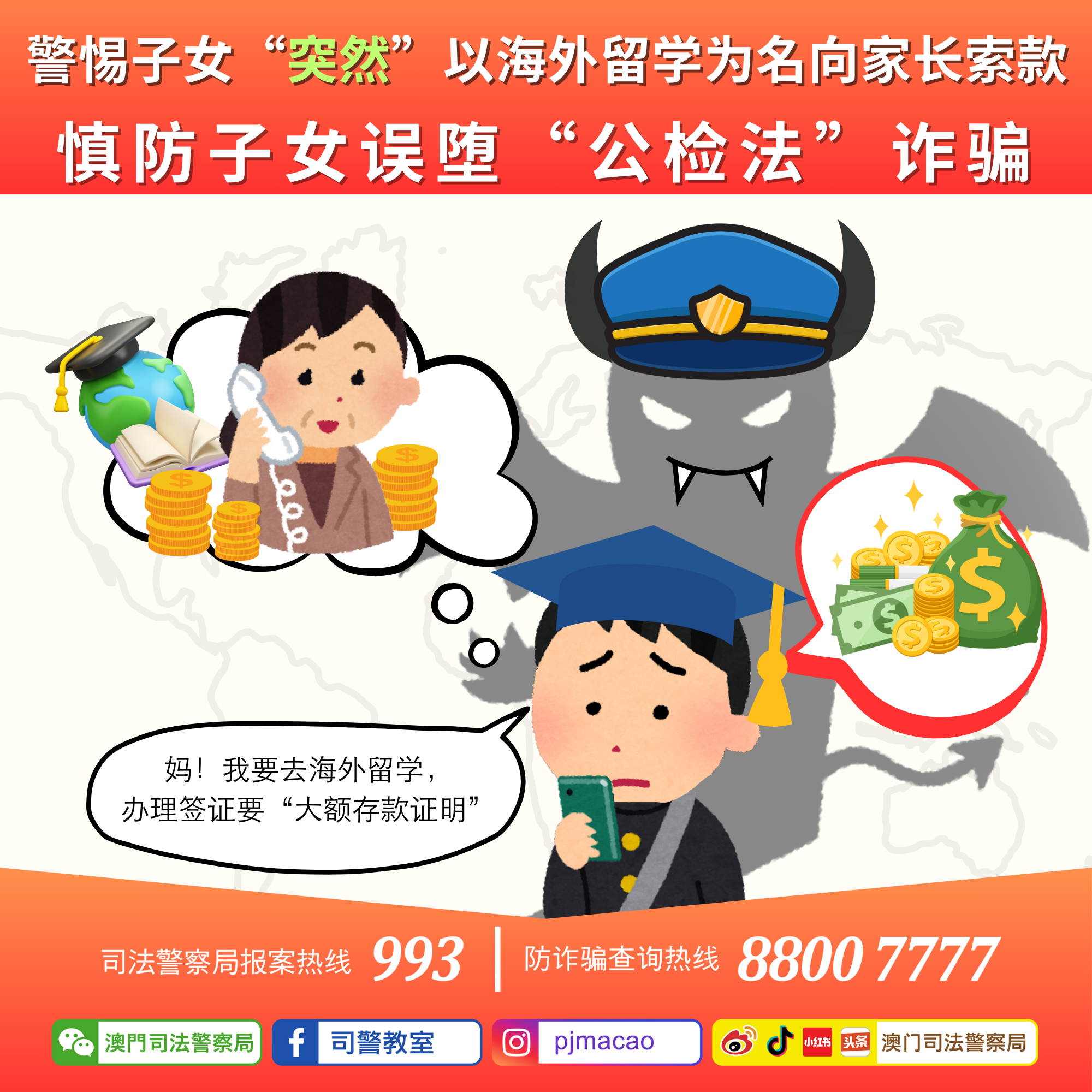 近日,司警局接获数名家长检举,报称早前正在海外升学的子女,因即将前往其他国家留学,办理签证需“大额存款证明”为由,向家长索取巨款。家长未经深入了解,贸然向子女汇出款项,而子女收取款项后,随即汇予骗徒。惟事后家长才发觉子女误堕“公检法”电话诈骗,招致巨额财产损失。