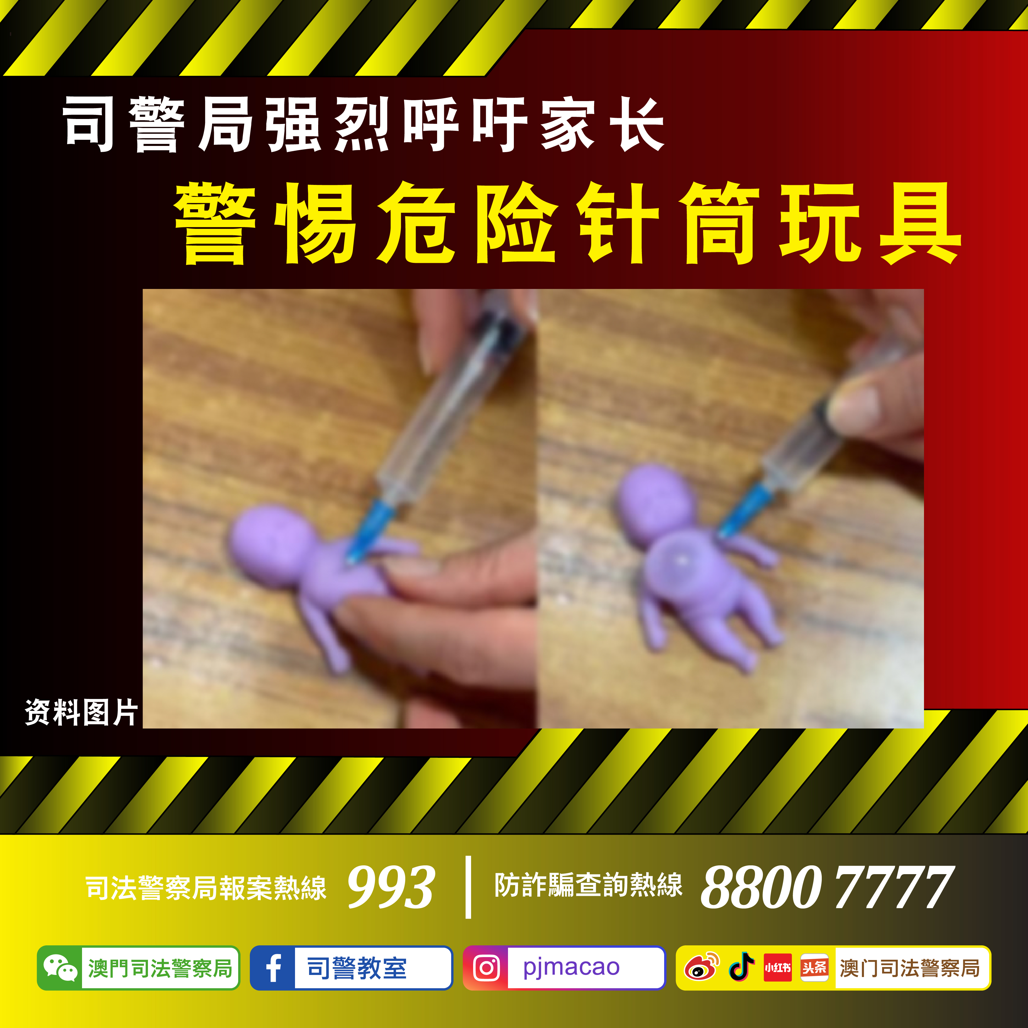 近日,司警局接获市民反映指有邻近地区网上平台及玩具店出售一款针筒玩具(或称“捏捏乐”、“挤痘痘”等),让购买者利用针筒将液体或空气注射到硅胶玩偶内,使其膨起水泡或气泡,再将之捏破。由于有关针头非常锋利,针尖与一般医疗针头相似,倘若青少年将之视作玩具,譬如模仿医护人员,将空气或不明液体注入自己或他人身体内,可造成身体严重损伤,甚至引致死亡。