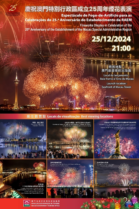 今年为中华人民共和国成立75周年及澳门回归祖国25周年,旅游局将于12月25日晚上9时,在澳门旅游塔对出海面举行“庆祝澳门特别行政区成立25周年烟花表演”,向国家和澳门特区致以美好的祝愿,为居民和旅客送上喜悦及祝福。烟花表演迭加“2024幻彩耀濠江”,加上烟花在圣诞假期燃放,全城将洋溢节庆热闹气氛,展现澳门“旅游+盛事”魅力。