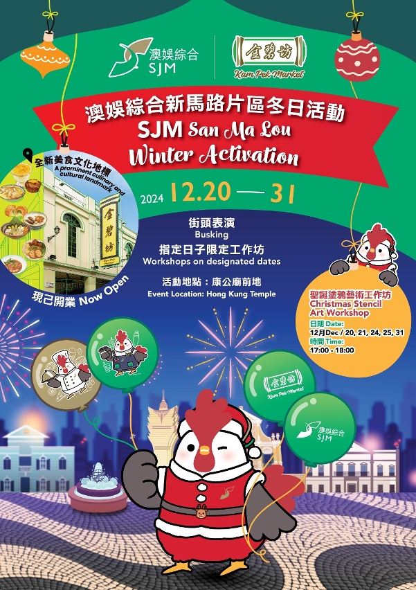 澳娱综合度假股份有限公司将于12 月 20 至 31 日期间在新马路片区举办一系列精彩活动,多场街头表演将于康公庙前地广场举行,并与澳门青年美术协会于12月期间联手举办多场圣诞涂鸦工作坊。此外,新马路的全新美食文化地标“金碧坊”已投入营运,引入多家中小企美食商铺,为新马路片区注入新的活力与魅力。
