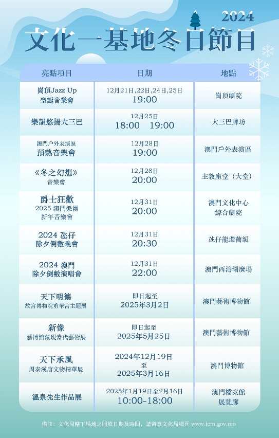 有关文化局冬日系列活动详情,可浏览文化局网页www.icm.gov.mo、Facebook专页“IC Art 艺文栈”、微信公众号“澳门文化局IC”及澳门活动网“享澳门”。历史片区系列活动可留意有关企业网页。