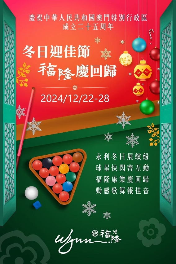 为庆祝中华人民共和国澳门特别行政区成立25周年以及欢度佳节,永利渡假村(澳门)股份有限公司将于圣诞期间在福隆新街步行区注入喜庆和康乐元素,设有“国民斯诺克”的康乐棋体验,多场快闪表演和市集,并提供多种充满特色的节日限定饮品。
