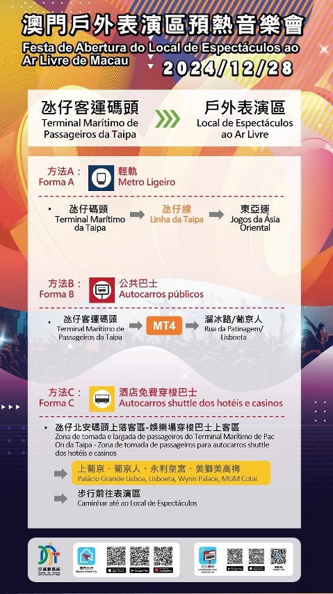 配合音乐会结束后观众离场的出行需要,巴士、轻轨将临时调整服务,以进一步提升运载效率。届时设有两条免费接驳巴士路线,分别前往“亚马喇前地”及“关闸”;轻轨采取分流安排,“东亚运”站前往横琴口岸、氹仔市区及妈阁方向、“路氹东”站则前往机场及氹仔客运码头方向;乘客于氹仔客运码头可转乘巴士103X路线前往港珠澳大桥澳门口岸。此外,观众亦可先步行前往周边娱乐综合体,乘搭的士或博企穿梭巴士离开。建议观众离场时留意现场指示牌及按照工作人员指引,根据目的地方向选择合适的交通工具离开。
