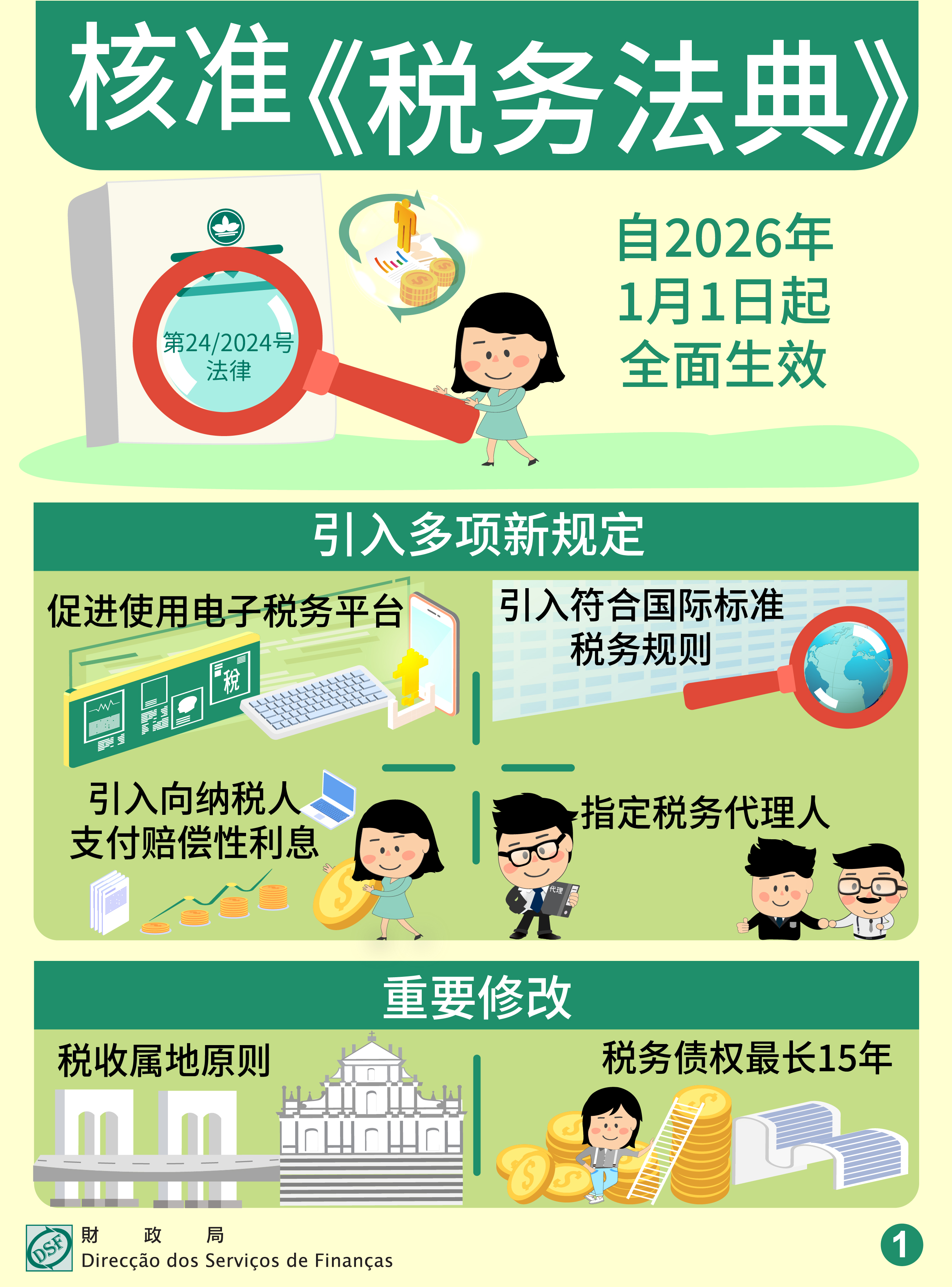 为优化澳门特区的营商环境及提升引资的竞争力,特区政府对现行税务法律作出重大改革,制定一套统一及贯穿整个税务法律关系的税收规范,并与国际税收标准趋同的现代化税务制度,以配合特区经济的长远发展。《政府公报》今(30)日刊登第24/2024号法律 - 核准《税务法典》,相关规定自2026年1月1日起全面生效。