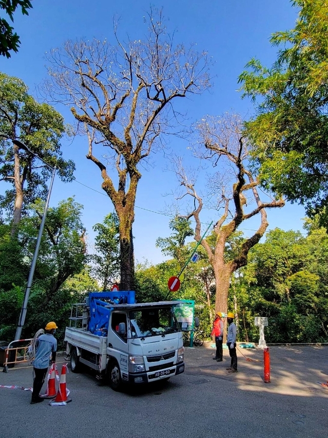 市政署持续跟进松山市政公园两株患褐根病石栗古树的情况,为保障公众安全,于今(6日)起对古树进行控高修剪,并会继续监察其健康状况。
