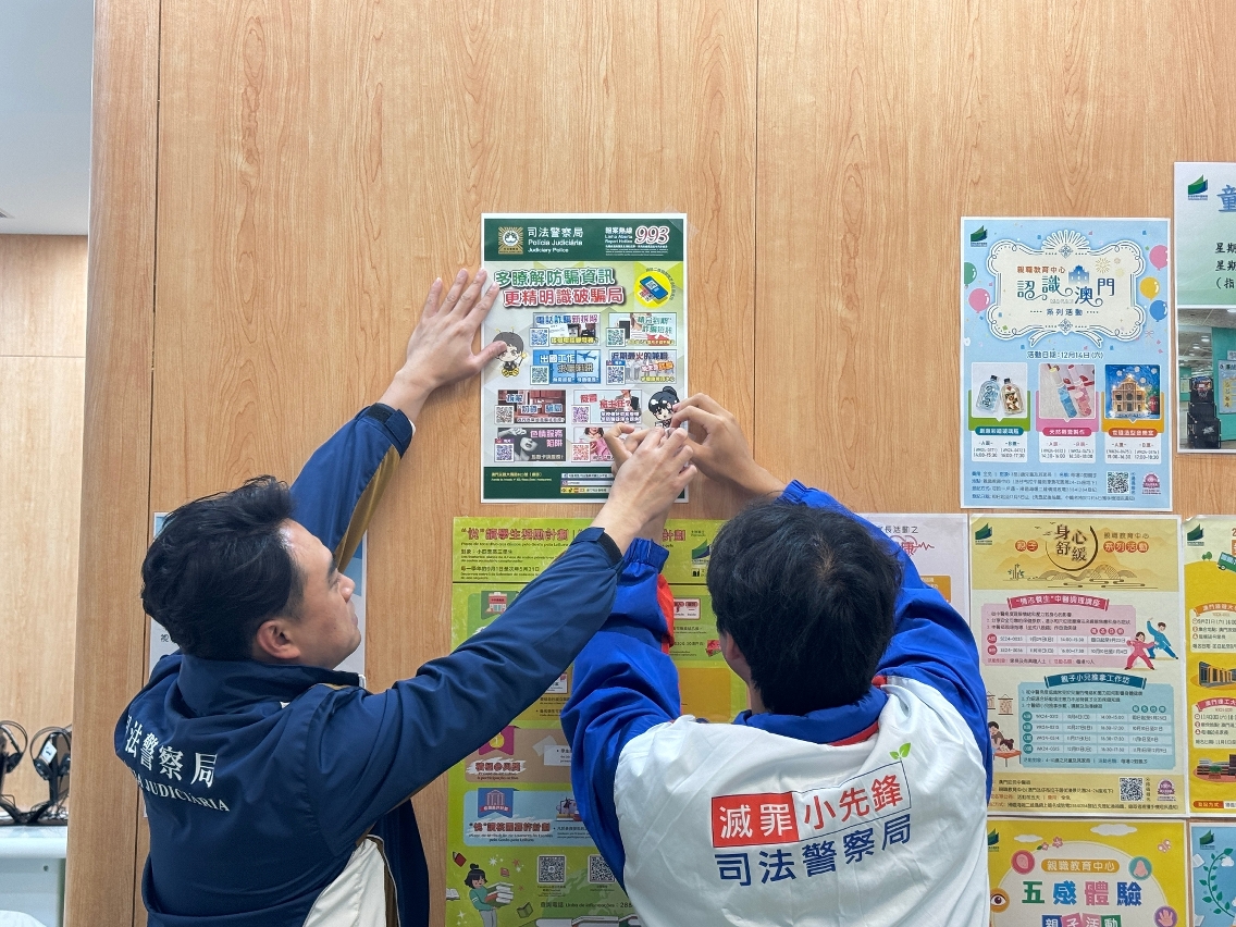 司法警察局继续推进“校园防骗疫苗计划”各项行动,为令防骗资讯由校园延伸并覆盖至社区,让学生群体于课余时也能接触到防骗资讯,时刻提高警觉,司警局持续走访教育及青年发展局辖下的活动中心、阅读室及自修室等场所进行防骗宣教工作,提醒青少年注意防范电讯网络诈骗。