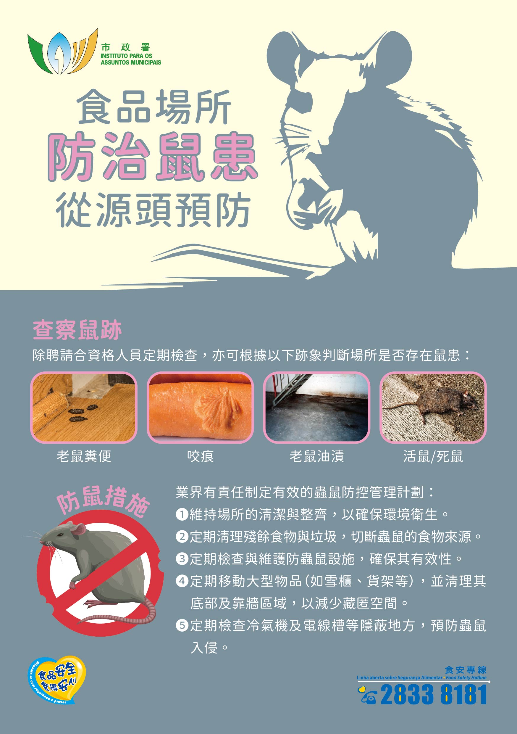 另外,为保障环境卫生及食品安全,截至本月七日市政署已对本澳逾一百四十间超级市场展开食安巡查,并对当中可能存有卫生隐患的店铺即时提出改善建议,督促采取有效的防治鼠患管理措施,提升员工防治虫鼠意识。市政署将持续巡查监管食品生产经营场所,一旦巡查中发现食安隐患,将根据《食品安全法》采取预防及控制措施,包括勒令场所进行彻底清洁消毒、销毁有问题食品,甚至暂停场所运作。