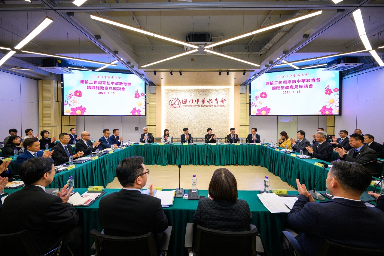 中华教育会会长陈虹欢迎谭伟文一行到访。该会代表对于运输工务范畴所开展的工作给予肯定,均指出近年来大型工程不断完善及落成,澳门国际大都市不断发展和提升。该会代表还就国有土地规划、增加校舍空间、增加标准运动设施、争取更多体育用地给年青人使用、向学生加强宣传运输工务范畴工作、完善交通安全配套设施、加快轻轨建设、加大推动智慧交通出行、引入更多公交类型、改善长者出行条件、提升的士司机服务素质、持续完善经屋法以配合家团成员的变化、不断推进环保宣传工作、减少道路工程重复开挖,以及加强宣传天气预报等议题表达关注和提出建议。
