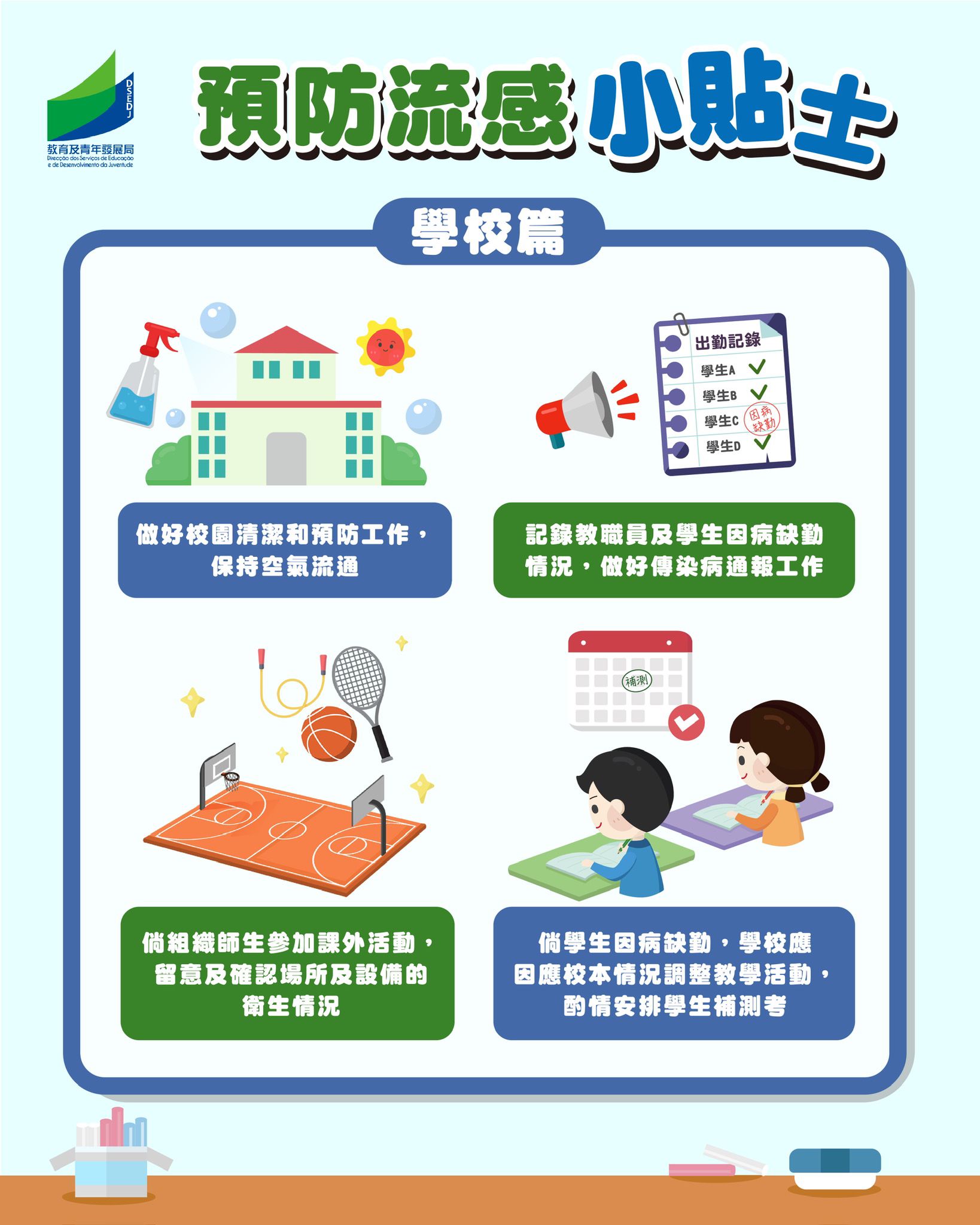学校方面,随着流感季节及春节假期将至,教青局将于明(15)日与全澳学校举行会议,提醒学校做好校园清洁和预防工作,保持校园环境卫生清洁及空气流通,加强健康教育。此外,学校应持续了解春节假期前后学生的身体情况。家长亦须时刻留意子女的身体状况,尤其新春假期计划外游时,须注意提高卫生意识,如有不适应尽快就诊及留在家中休息,及时通知学校子女的情况。
