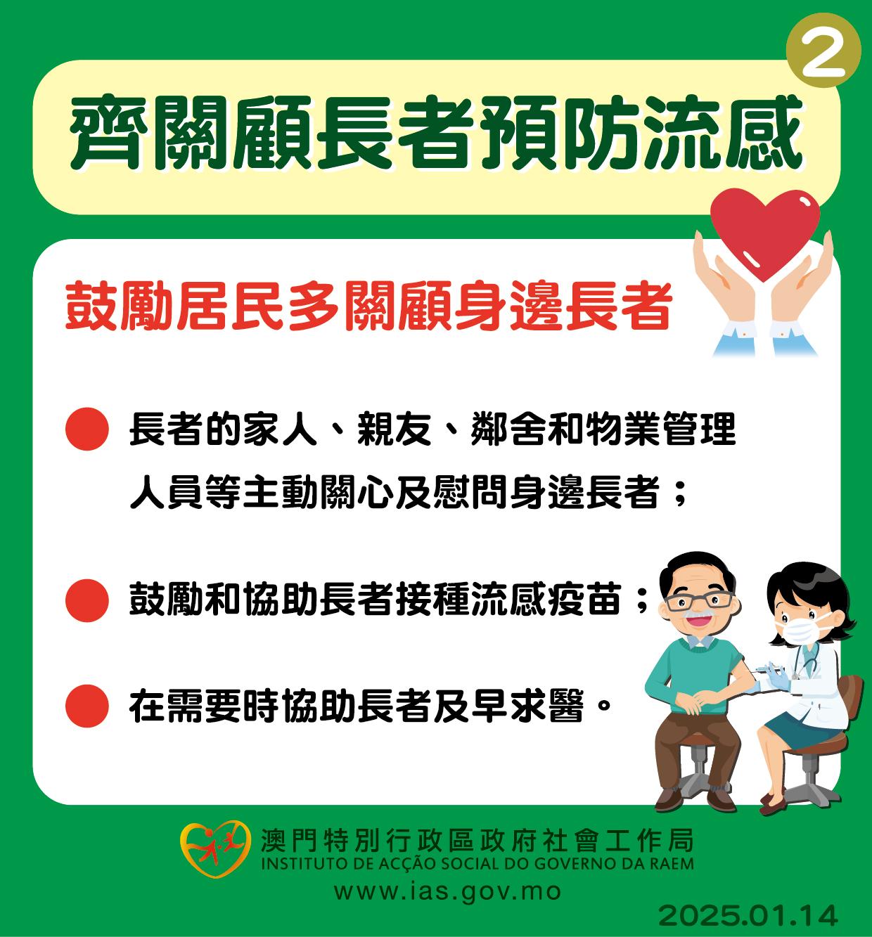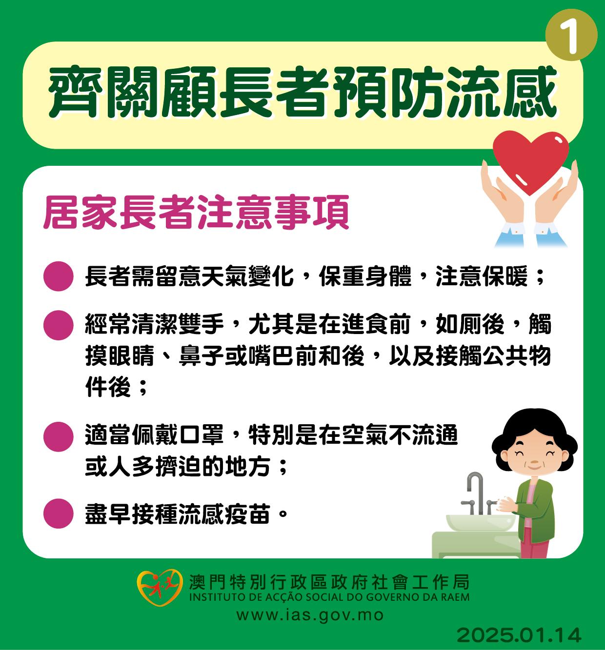 此外,社会工作局呼吁长者,尤其属独居或两老家庭的长者留意天气变化,保重身体,注意保暖,在人多挤迫的地方应佩戴口罩。倘有不适,应及早求医,并在需要时向家人、亲友及/或社会服务设施等寻求协助。社会工作局同时呼吁长者的家人、亲友、邻舍和物业管理人员等主动关心及慰问身边长者。