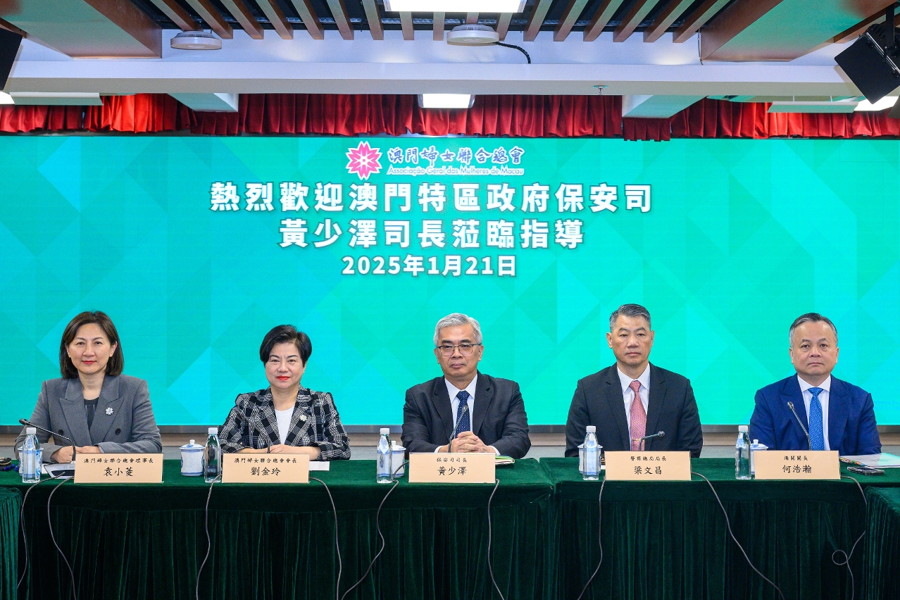 保安司司长黄少泽今(21)日拜访澳门妇女联合总会并举行座谈会,继续就编制保安范畴本年度施政方针听取意见。