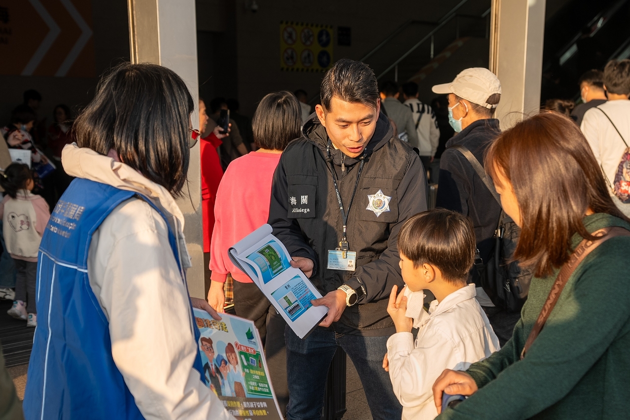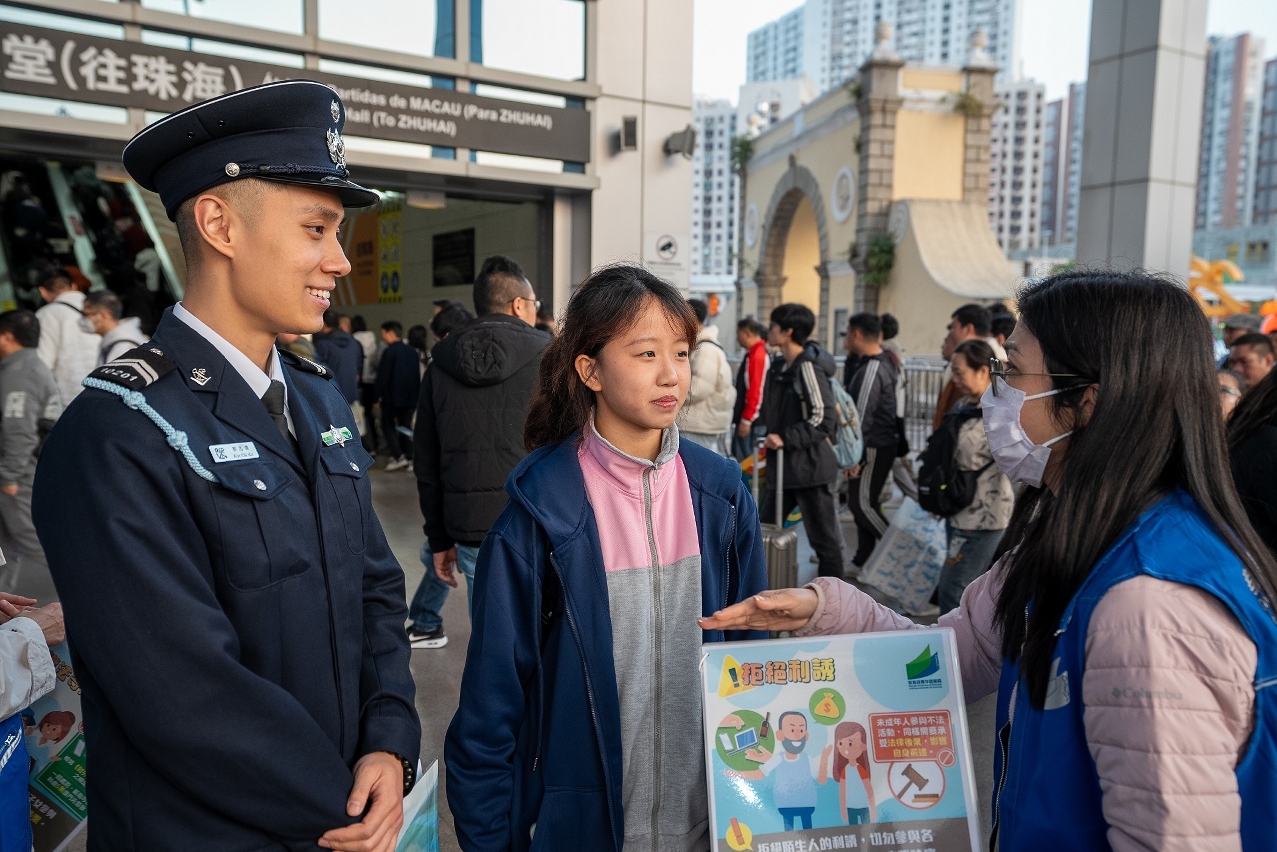为加强青年学生的识法守法意识,尤其在春节长假期间提高警觉,教青局联同澳门海关跨部门合作,在关闸口岸一带进行社区推广活动,提醒青年学生慎防不法份子的欺骗及利诱,切勿参与任何可疑及不法的活动如“走水货”行为,以及切勿误信来历不明平台的招聘资讯、“赚快钱”等宣传手段。同时,提醒青年学生及其家长,参与不法贩运活动需要承受法律后果,不仅影响自身前途,还可能对家庭和社会造成负面影响,家长应以身作则,为子女树立良好榜样。