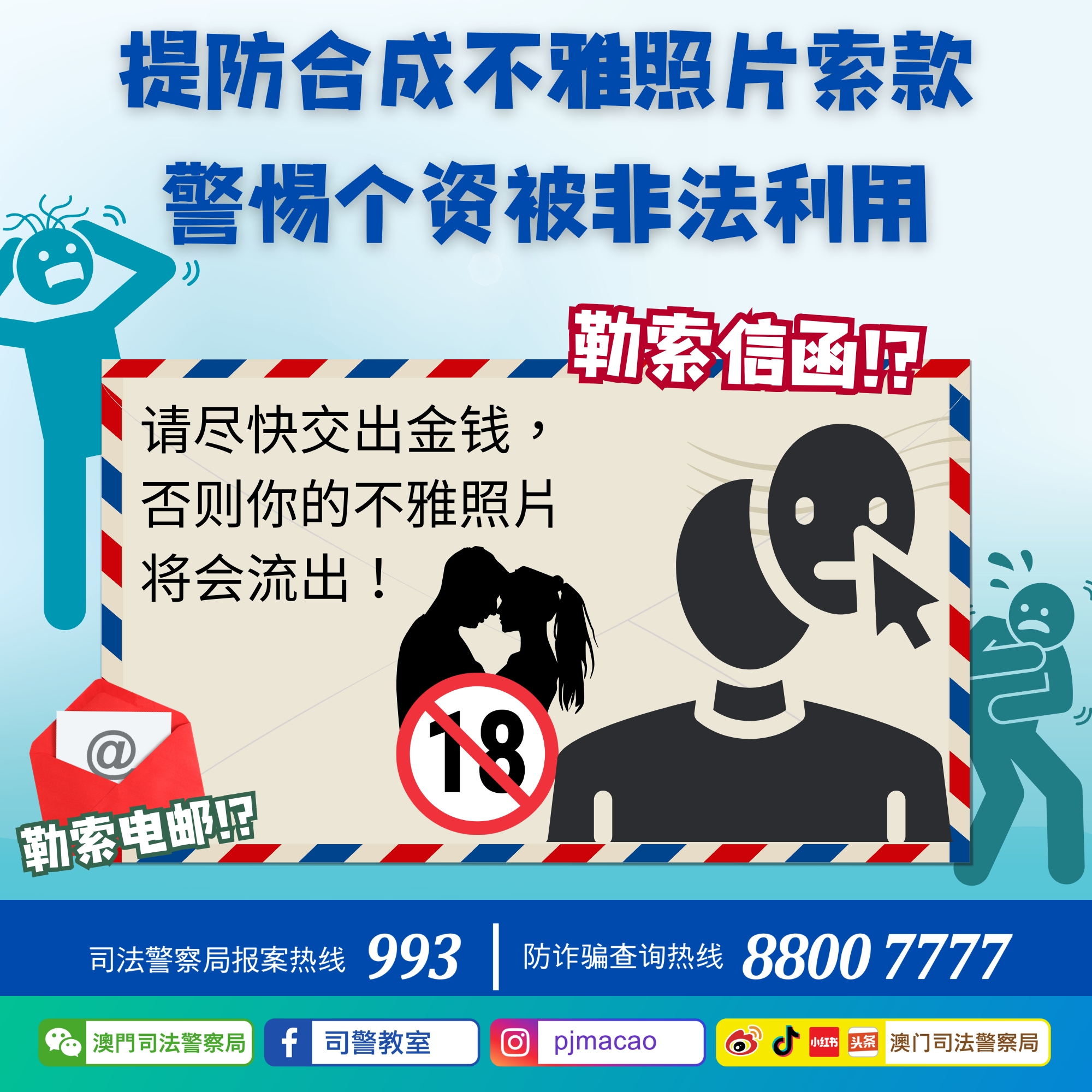 直至近日,司警局再接获市民检举,报称其办公地点收到一封由外地邮寄送递的勒索信函,信函内同样附有合成的不雅照片。