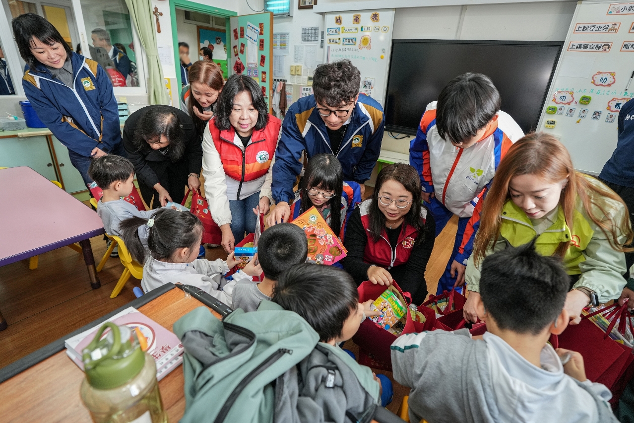 为弘扬关爱共融和奉献精神,并向社会大众传递支持与关怀复康人士的正面讯息,司法警察局联同“大厦防罪之友"和“妇女防罪之友"成员、“社区安全青年领袖计划"及“灭罪小先锋种子计划"(下称“两项青年计划")学员前往明爱学校探访学童,送上新春福包和节日祝福,祝愿他们新年快乐,健康成长。
