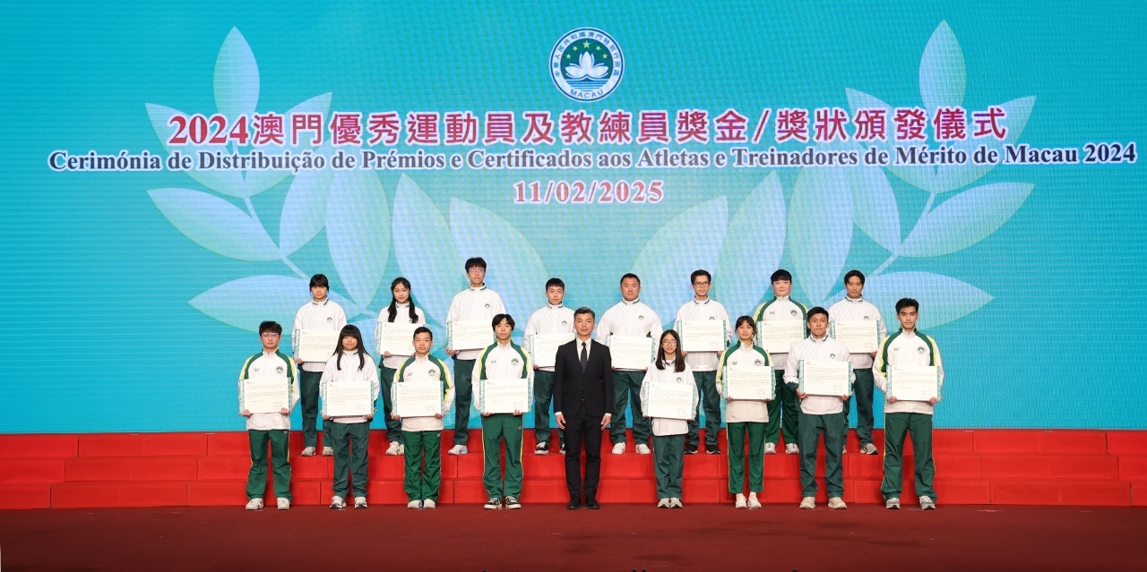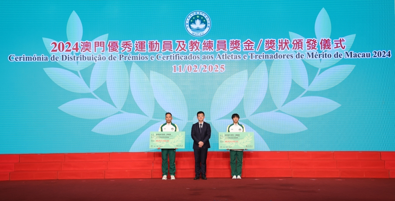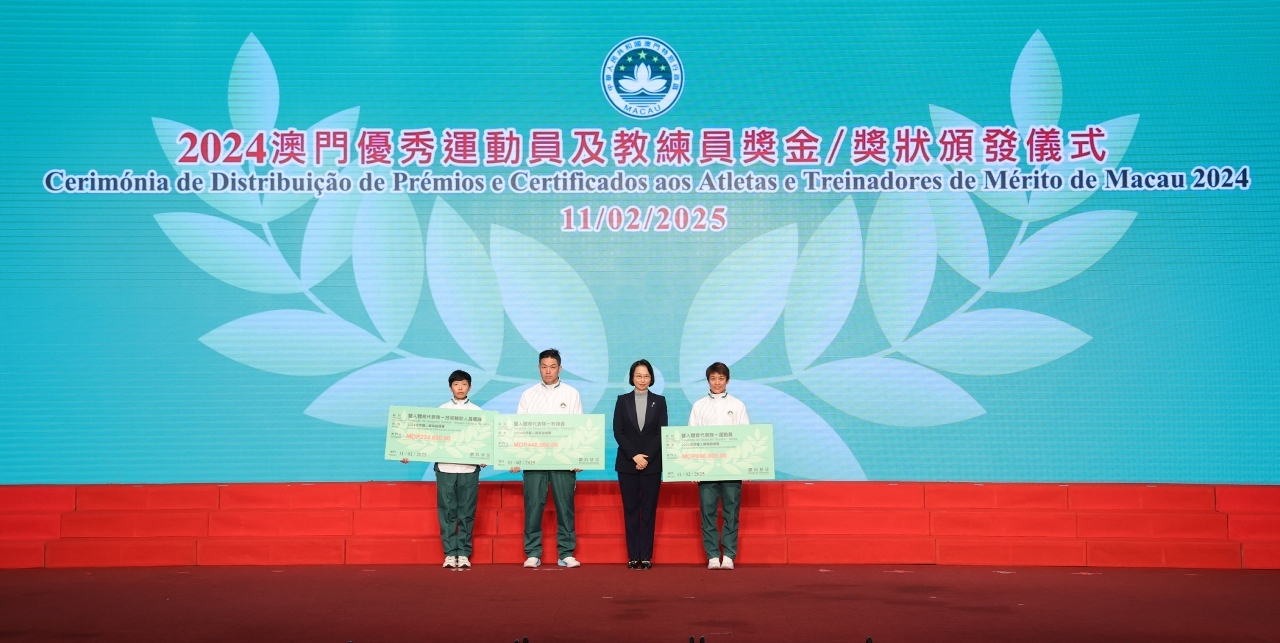 为表彰在2024年度参加体育比赛中获得优秀成绩的运动员、教练员及技术辅助人员,「2024澳门优秀运动员及教练员奖金/奖状颁发仪式」今(11)日晚上七时半举行,澳门特别行政区政府社会文化司司长柯岚等出席了颁发仪式,并祝贺获奖的队伍。
